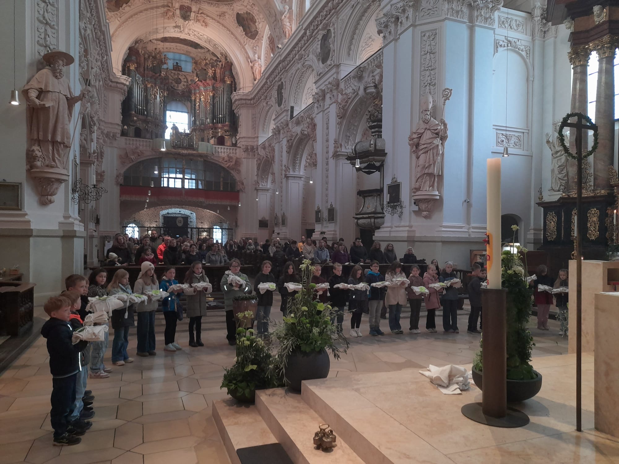 Beim Familiengottesdienst am Weißen Sonntag haben die Erstkommunionkinder ihre Gewänder erhalten. Stadtpfarrer Dr. Thomas Vogl verwies mit dem Grössenunterschied von Tauf- und Kommunionkleid, dass man nicht nur körperlich, sondern auch im Glauben wachsen und groß...