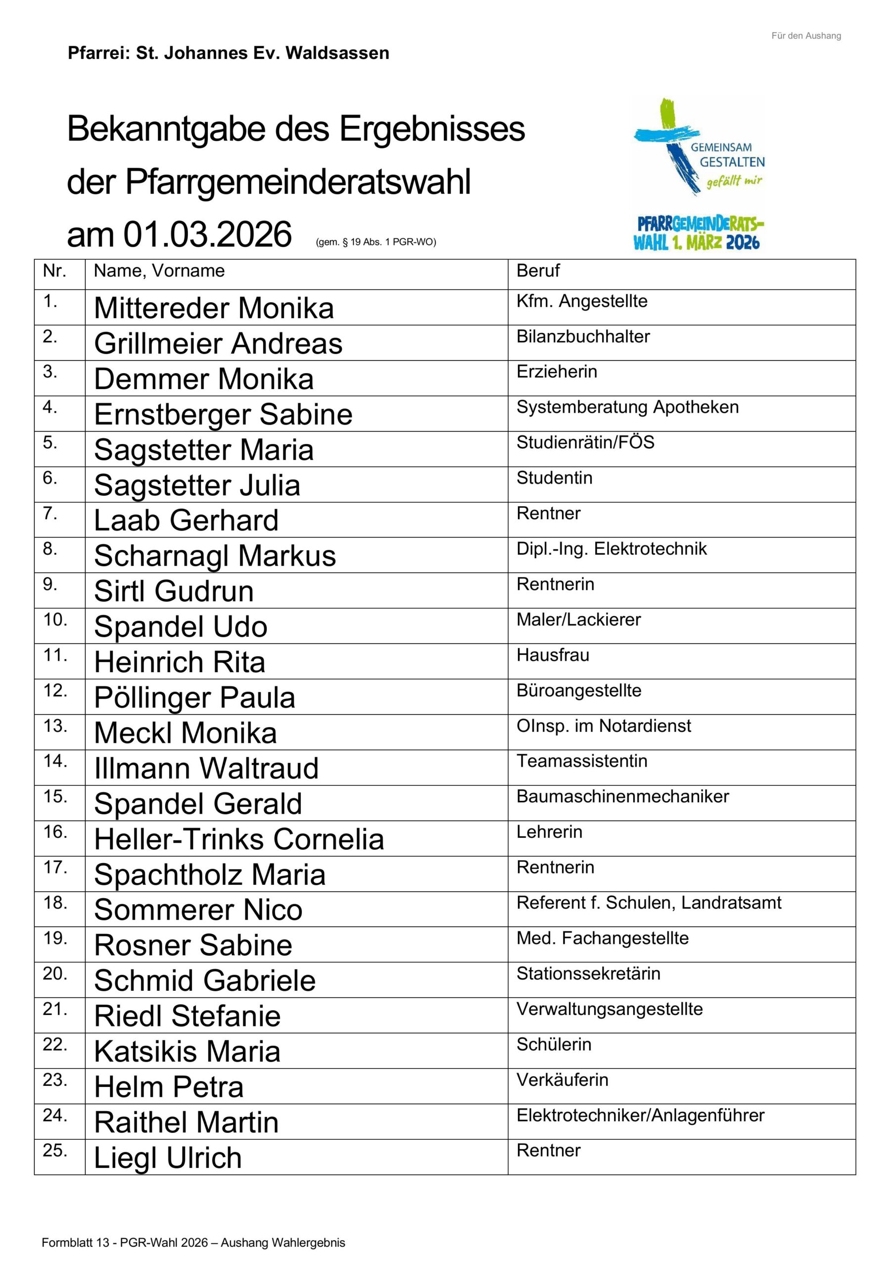 In Waldsassen wurde der Pfarrgemeinderat neu gewählt. Die Wahlbeteiligung lag bei 37%. Herzlichen Glückwunsch an alle Gewählten. Ein großes Dankeschön gilt allen, die sich bereit erklärt haben, zu kandidieren.