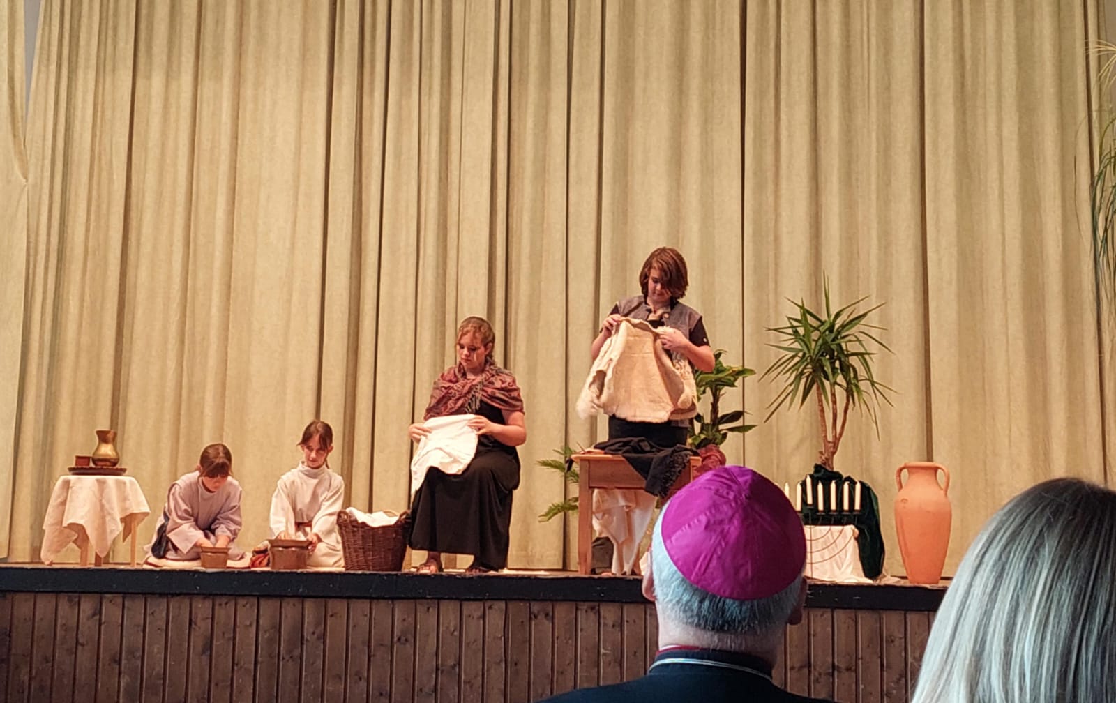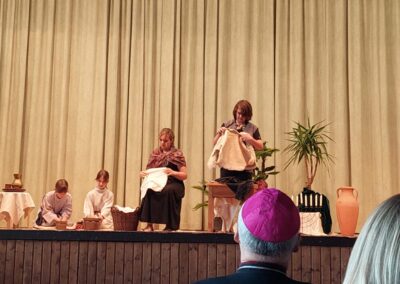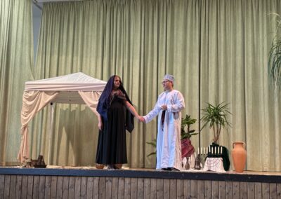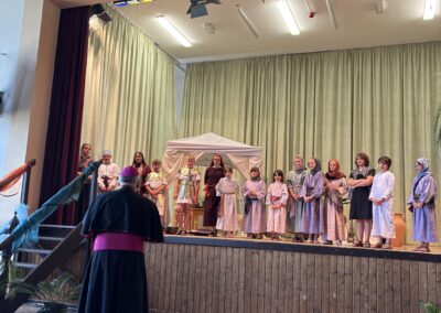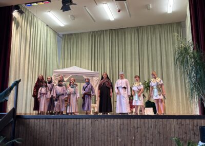 Das Familiengottesdienstteam um Gertrud Hankl sorgte mit Requisiten und Kostümen für das orientalische Flair. Dazu musste viel in die Halle herangeschafft und transportiert werden. Doch der Aufwand hat sich mehr als gelohnt. Die Zuschauenden wurden beim Spiel hineingenommen in diese besondere Zeit im alten Orient.