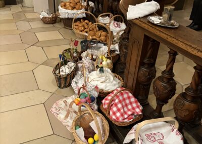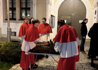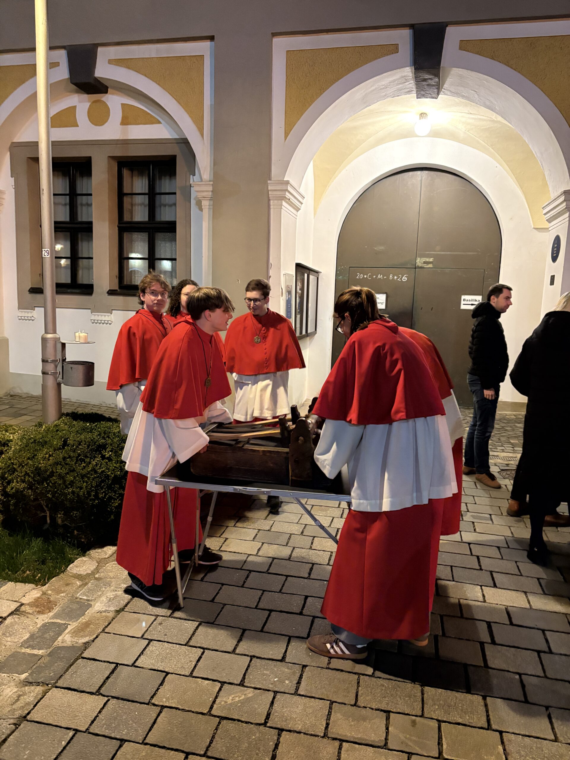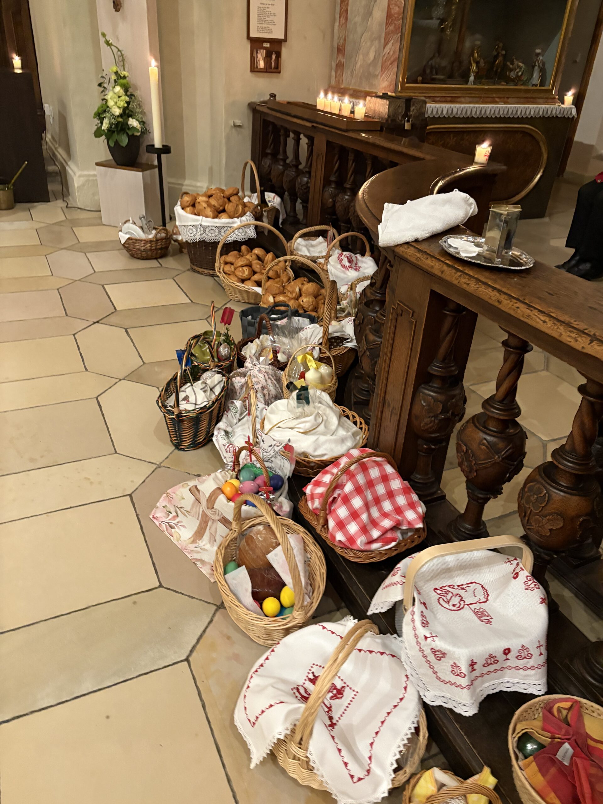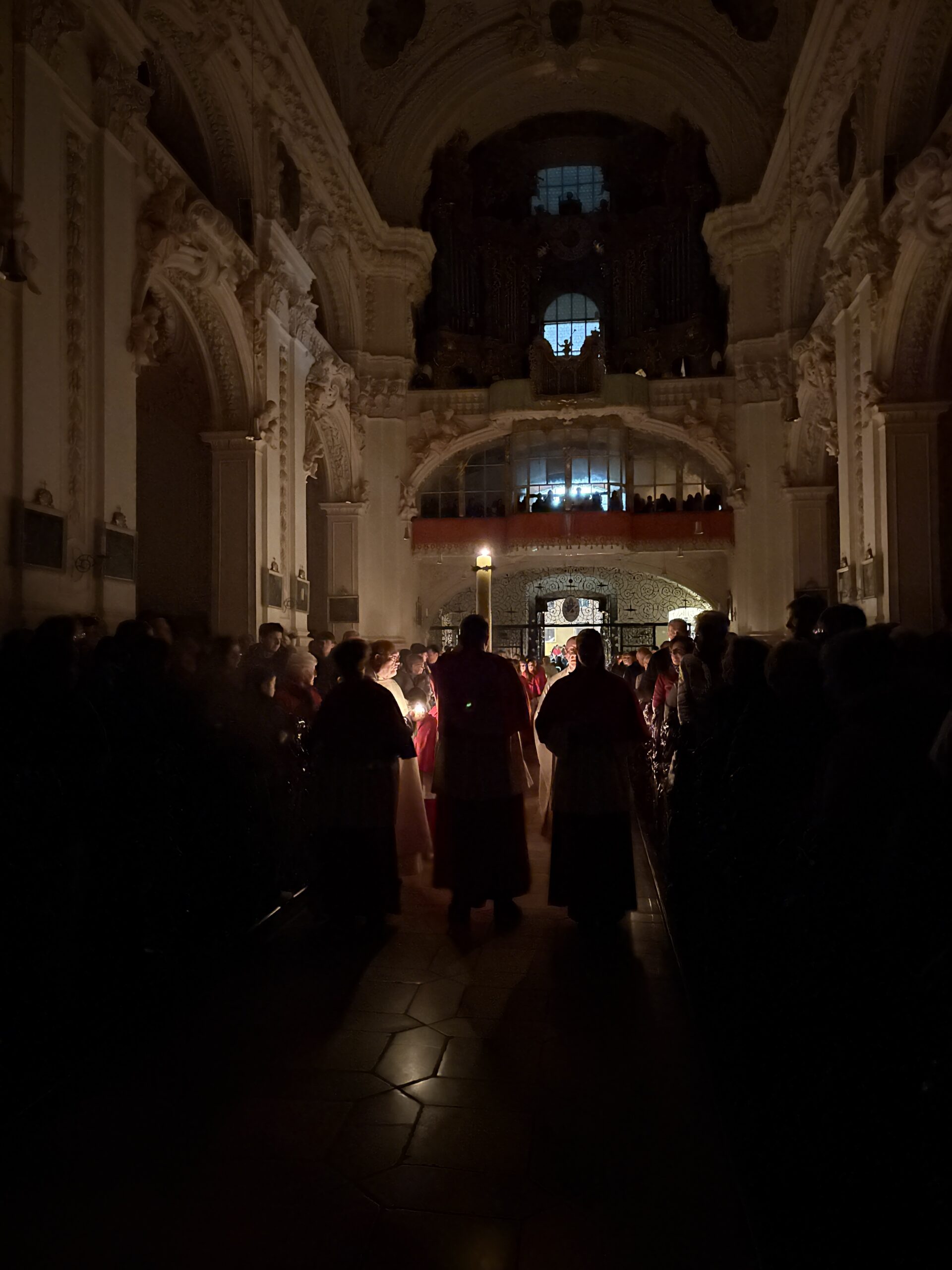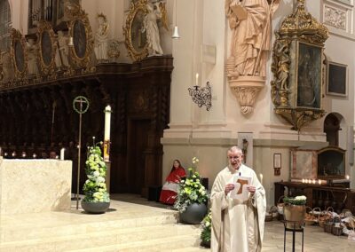Nach der Eucharistiefeier, der Segnung der Osterspeisen und einen langen Dankesliste mit vielen Diensten und Beteiligten, besonders auch für die beeindruckende „Passion inszeniert“ am Karfreitag, folgte natürlich das Osterlachen, das die Basilika mit frohem und hellem Lachen erfüllte. Nach dem feierlichen Ostersegen wünschten die Mitarbeiter der Pfarrei wünschten allen Mitfeiernden frohe und gesegnete Ostern und verteilten auf dem Basilikaplatz, wo das Osterfeuer noch brannte und wie jedes Jahr von der Jugendfeuerwehr Waldsassen vorbereitet und während der Liturgie beaufsichtigt wurde, kleine gesegnete Osterbrote an alle Mitfeiernden. Die Glocken der Basilika läuteten festlich beim Hinausgehen und begleiteten die Osterwünsche, die man sich zusagte hinein in diese heiligste Nacht des Jahres.
