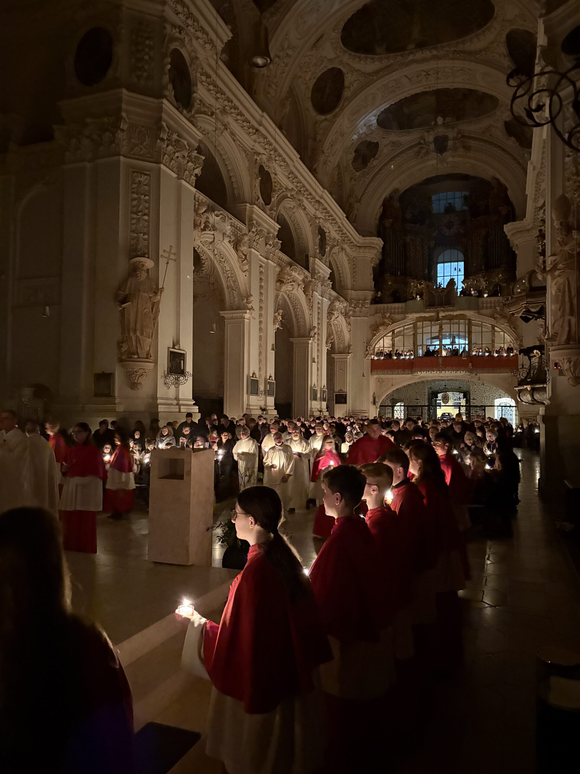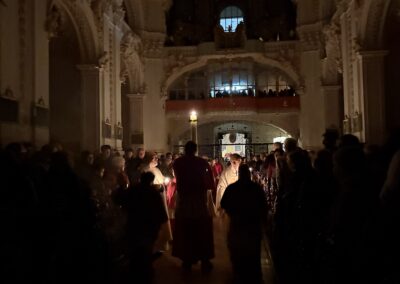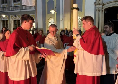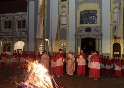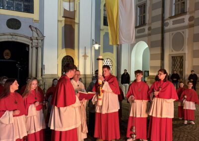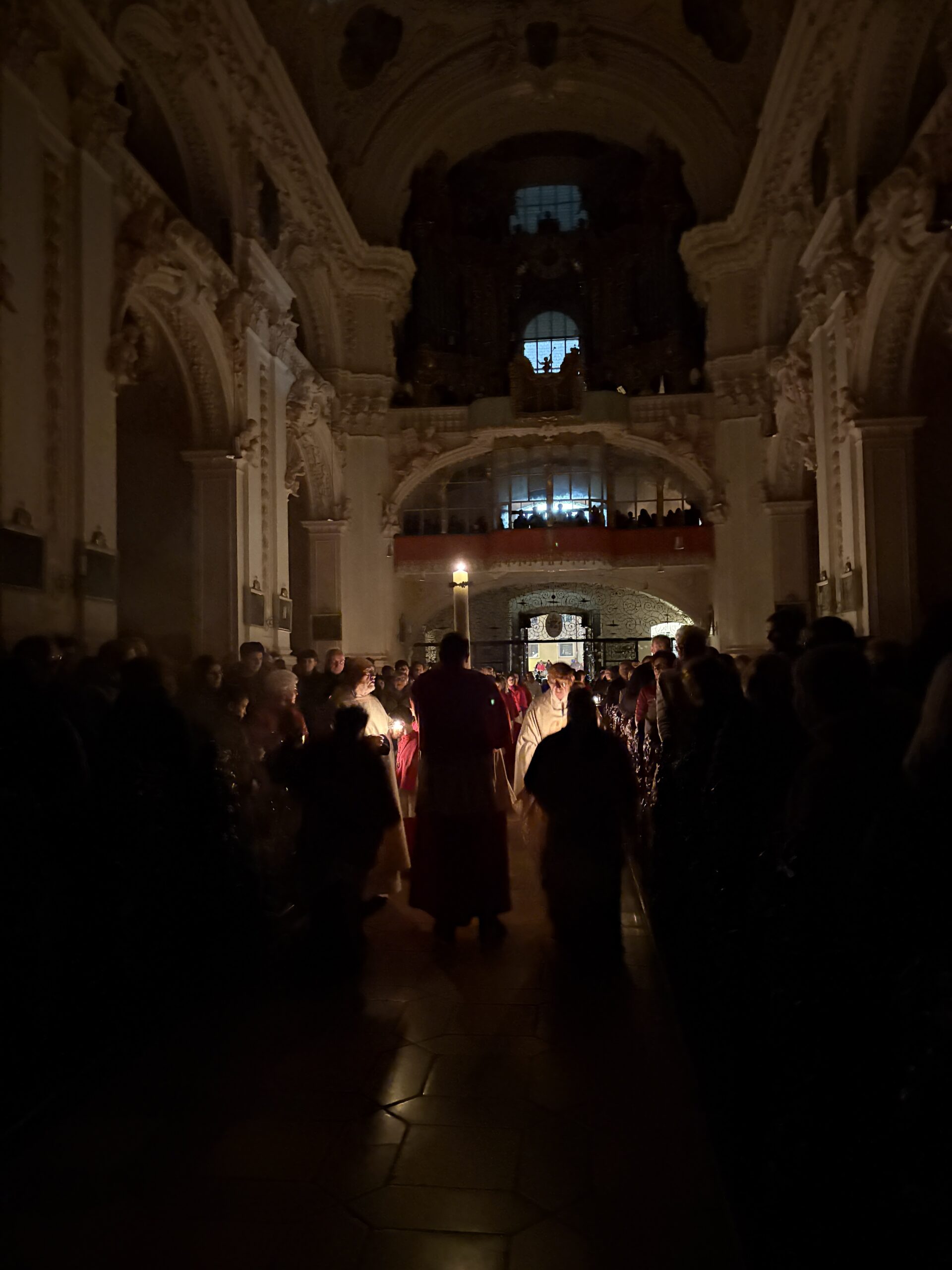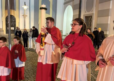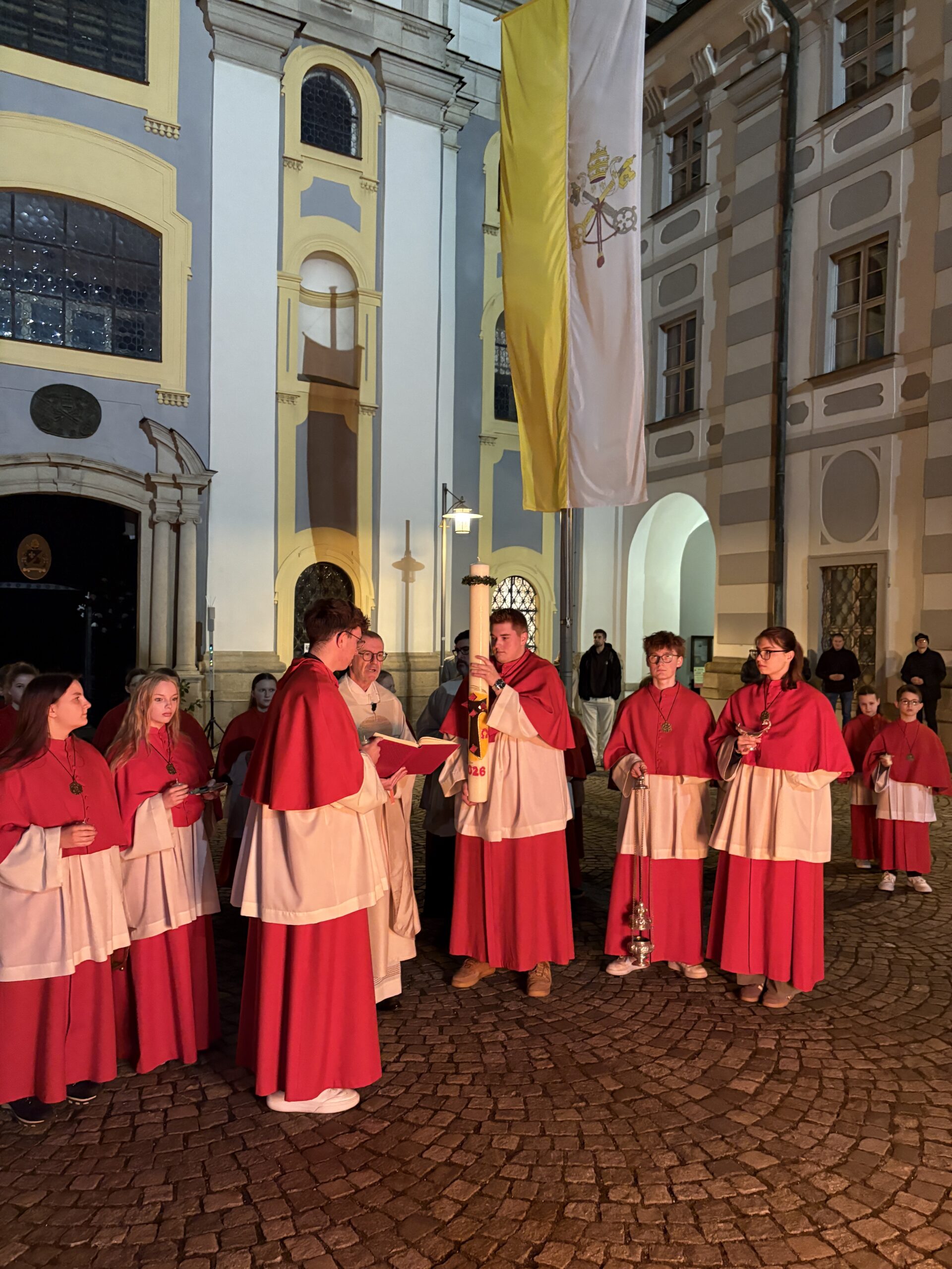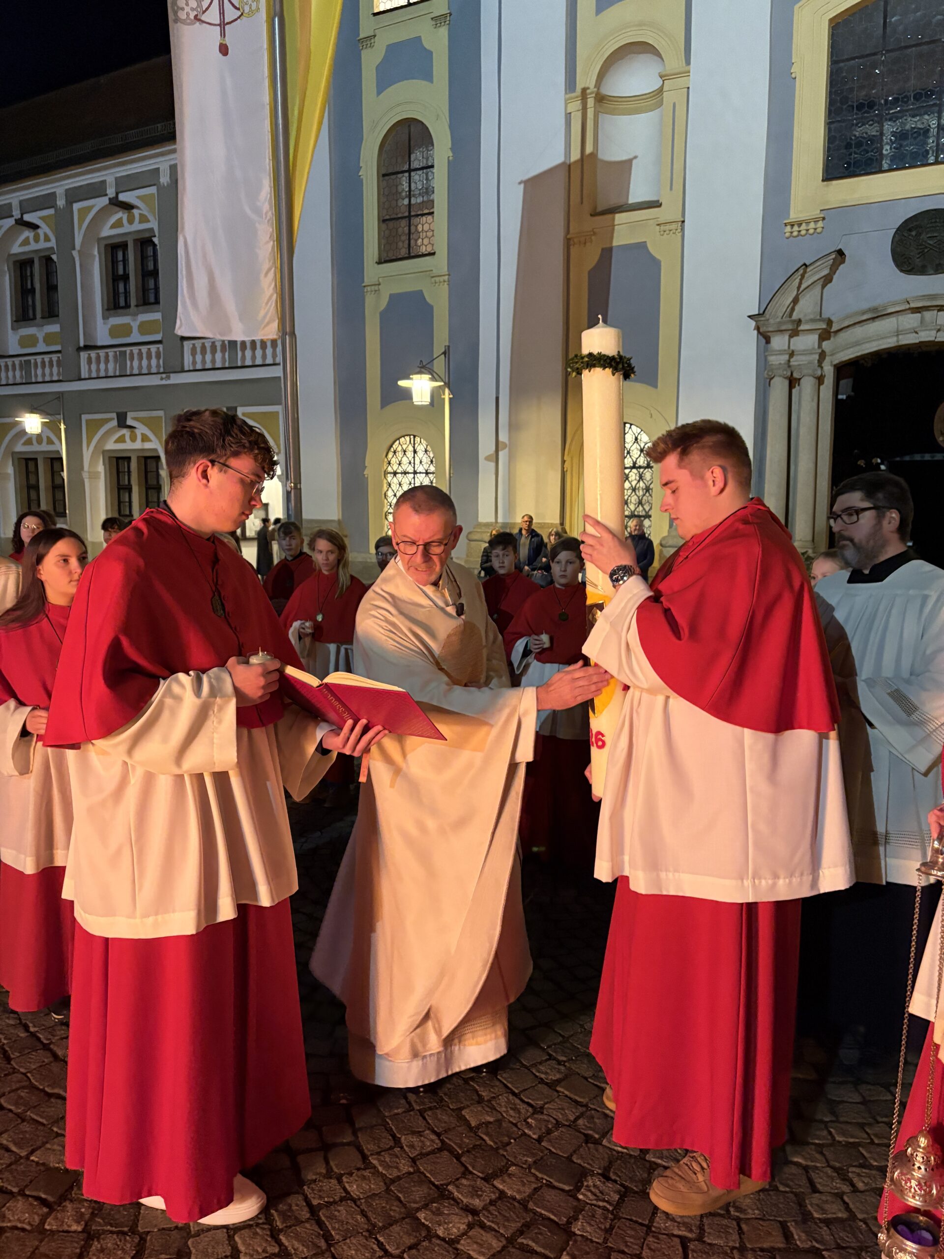 Der Höhepunkt des ganzen Kirchenjahres wurde in Waldsassen wieder mit einer beeindruckenden Osternachtfeier begangen. Stadtpfarrer Dr. Thomas Vogl segnete draußen zusammen mit Pfr. i.R. Anton Witt und im großen Kreis vieler Ministrantinnen und Ministranten den Kommunionkindern und Firmlingen das Feuer, bereitete dann die Osterkerze, die am Zug der langen Prozession in die dunkle Basilika getragen wurde. Mit dem dreimaligen Ruf „Lumen Christi“ wurde ihr Licht an alle Gläubigen weitergegeben, um dann im Schein der vielen Lichter das Exsultet, das Osterlob zu singen.
