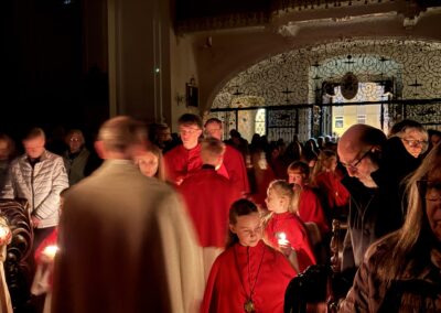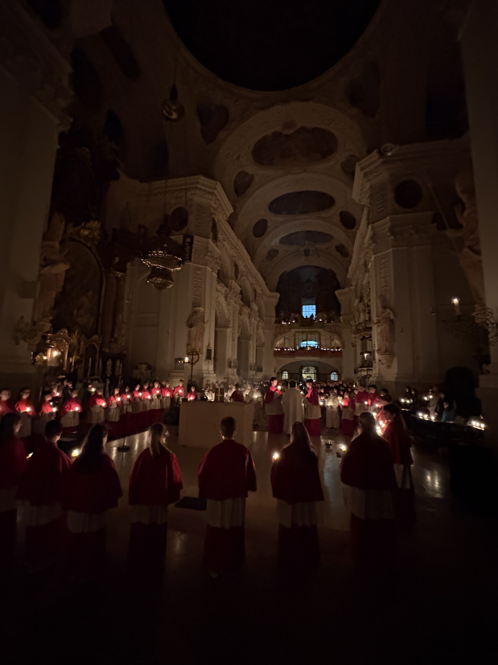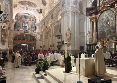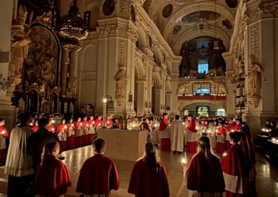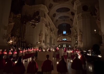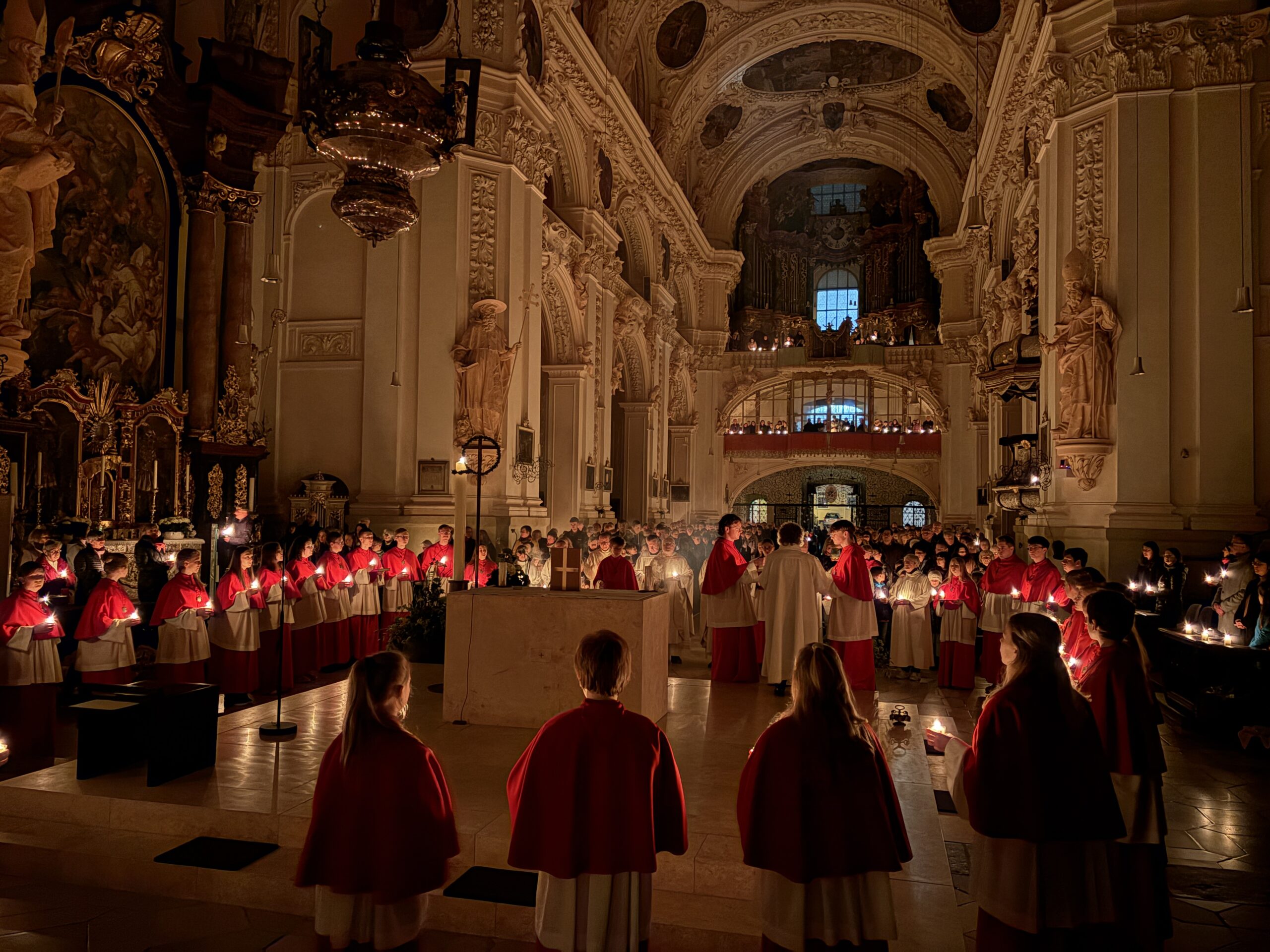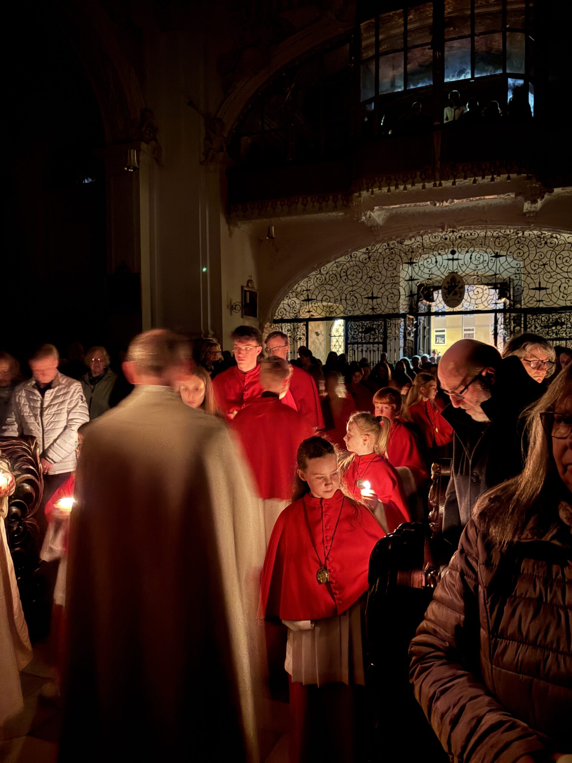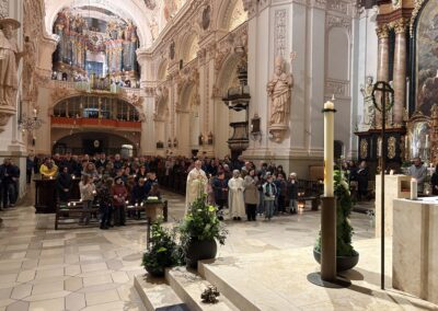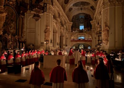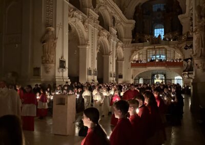 Der Höhepunkt des ganzen Kirchenjahres wurde in Waldsassen wieder mit einer beeindruckenden Osternachtfeier begangen. Stadtpfarrer Dr. Thomas Vogl segnete draußen zusammen mit Pfr. i.R. Anton Witt und im großen Kreis vieler Ministrantinnen und Ministranten den Kommunionkindern und Firmlingen das Feuer, bereitete dann die Osterkerze, die am Zug der langen Prozession in die dunkle Basilika getragen wurde. Mit dem dreimaligen Ruf „Lumen Christi“ wurde ihr Licht an alle Gläubigen weitergegeben, um dann im Schein der vielen Lichter das Exsultet, das Osterlob zu singen.