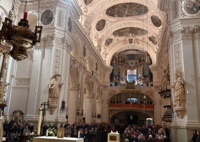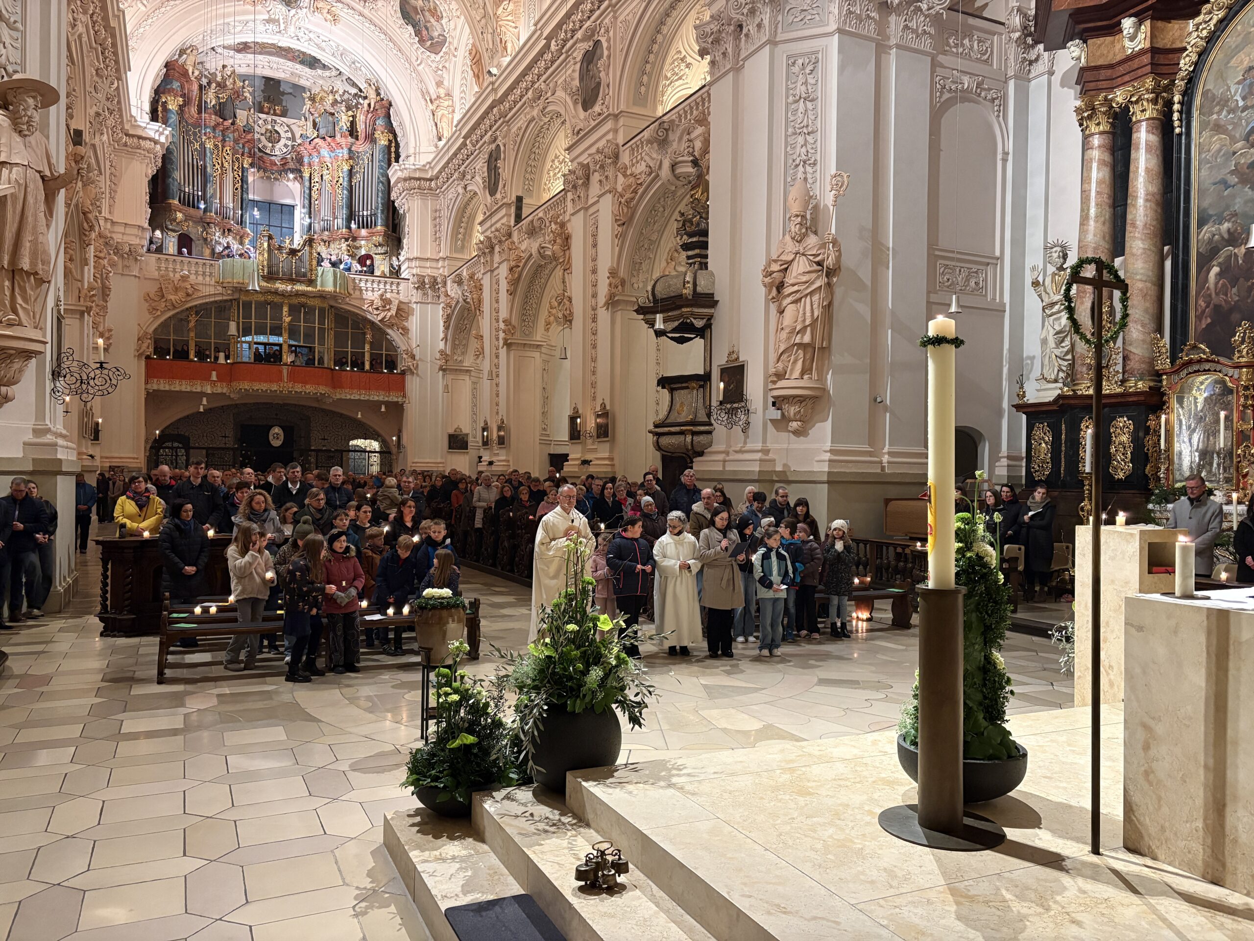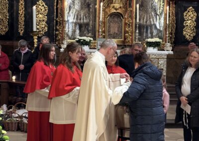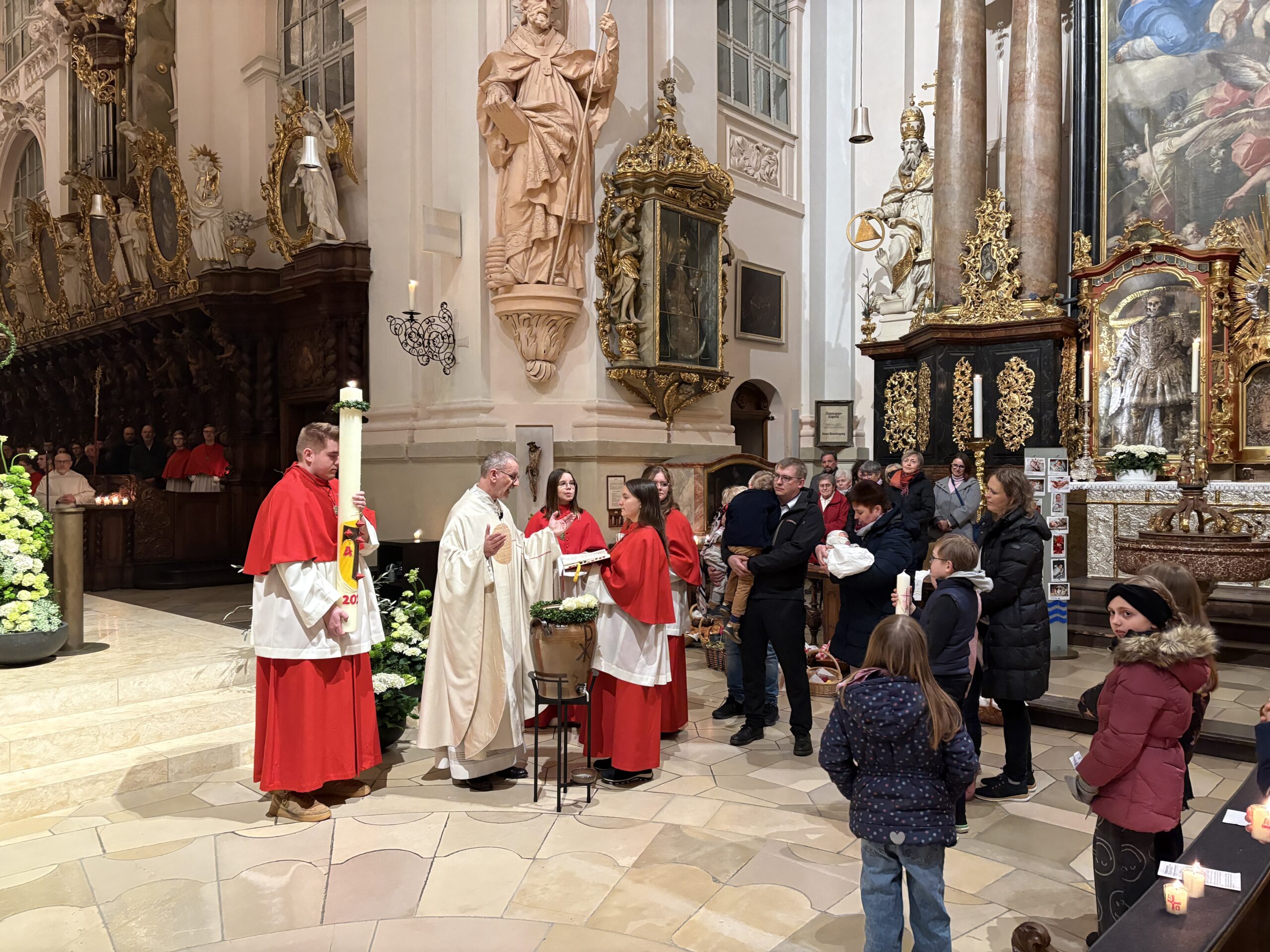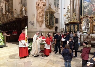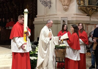 In der Tauffeier wurde dann Klara Fortelny in die Gemeinschaft der Kirche aufgenommen und mit dem Chrisam besiegelt, damit auch sie einmal Zeugin des Lebens, das Gott schenkt, wird. Schließlich erneuerten alle Gläubigen ihr Taufversprechen, zu dem dann das Osterwasser über die Gläubigen in der Basilika verteilt wurde.