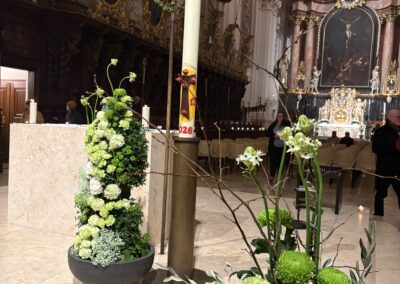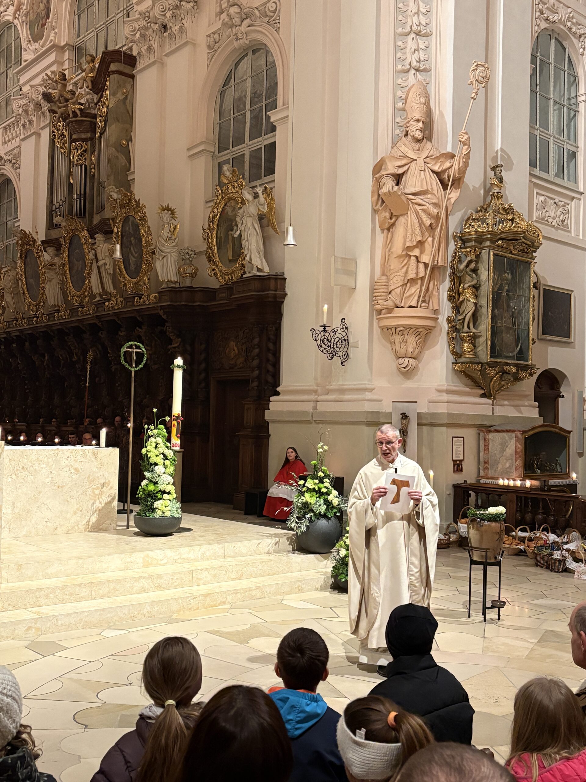 In seiner Predigt ging Stadtpfarrer Dr. Vogl mit den Kindern auf ein besonderes Zeichen an der Osterkerze ein: Anlässlich des Franziskusjahres gestaltete Sr. Agnes von der Abtei das “Tau-Zeichen“ an der Kerze. Franz von Assisi hat damit Briefe unterschrieben, die Zellen seiner Brüder geschmückt und auch unterwegs an Häuser als ein Segenszeichen geschrieben. Sowohl der Prophet Ezechiel als auch im letzten Buch der Bibel, der Geheimen Offenbarung des Johannes, ist von diesem Tau als einem Zeichen des Schutzes, der Erwählung und des Heiles die Rede. Es erinnert auch an das Kreuz, dem Zeichen unserer Erlösung. Christen sind durch Taufe und Firmung besiegelt und erwählt von Gott. Wie Franz von Assisi sollen wir deshalb auch Zeichen des Lebens und des Segens hinterlassen. Osterpuren, die wie das Tau an das erinnern, was Gott uns in der Auferweckung seines Sohnes schenkt.