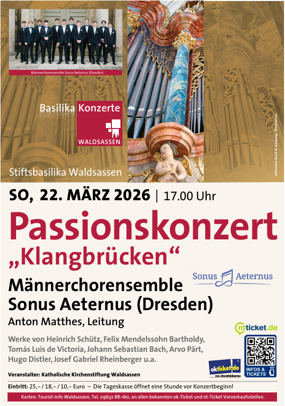 Veranstalter: Katholische Kirchenstiftung Waldsassen Eintritt: 25,- / 18,- / 10,- Euro – Die Tageskasse öffnet eine Stunde vor Konzertbeginn! Karten: Tourist-Info Waldsassen, Tel. 09632 88-160, an allen bekannten ok-Ticket und nt-Ticket Vorverkaufsstellen