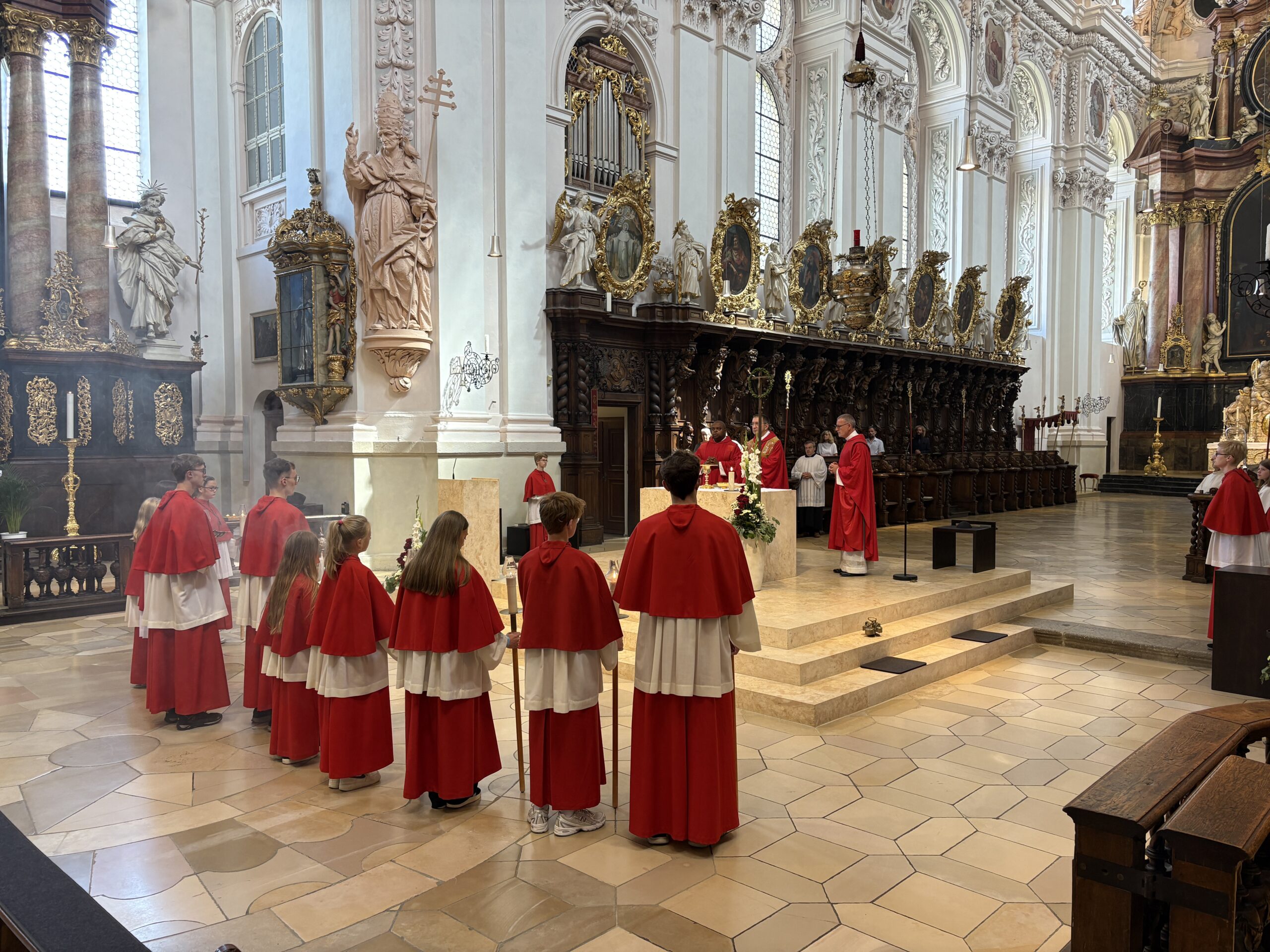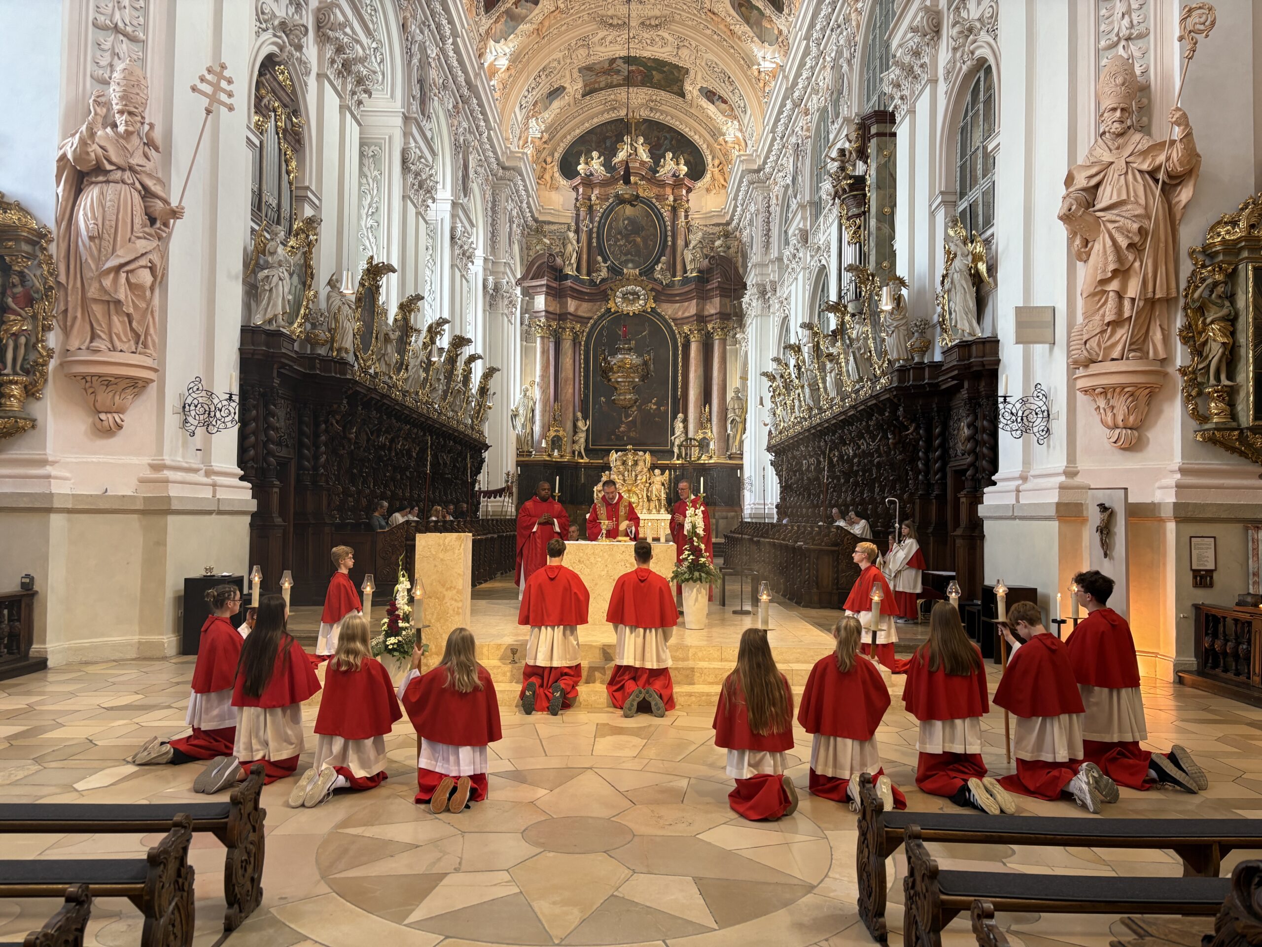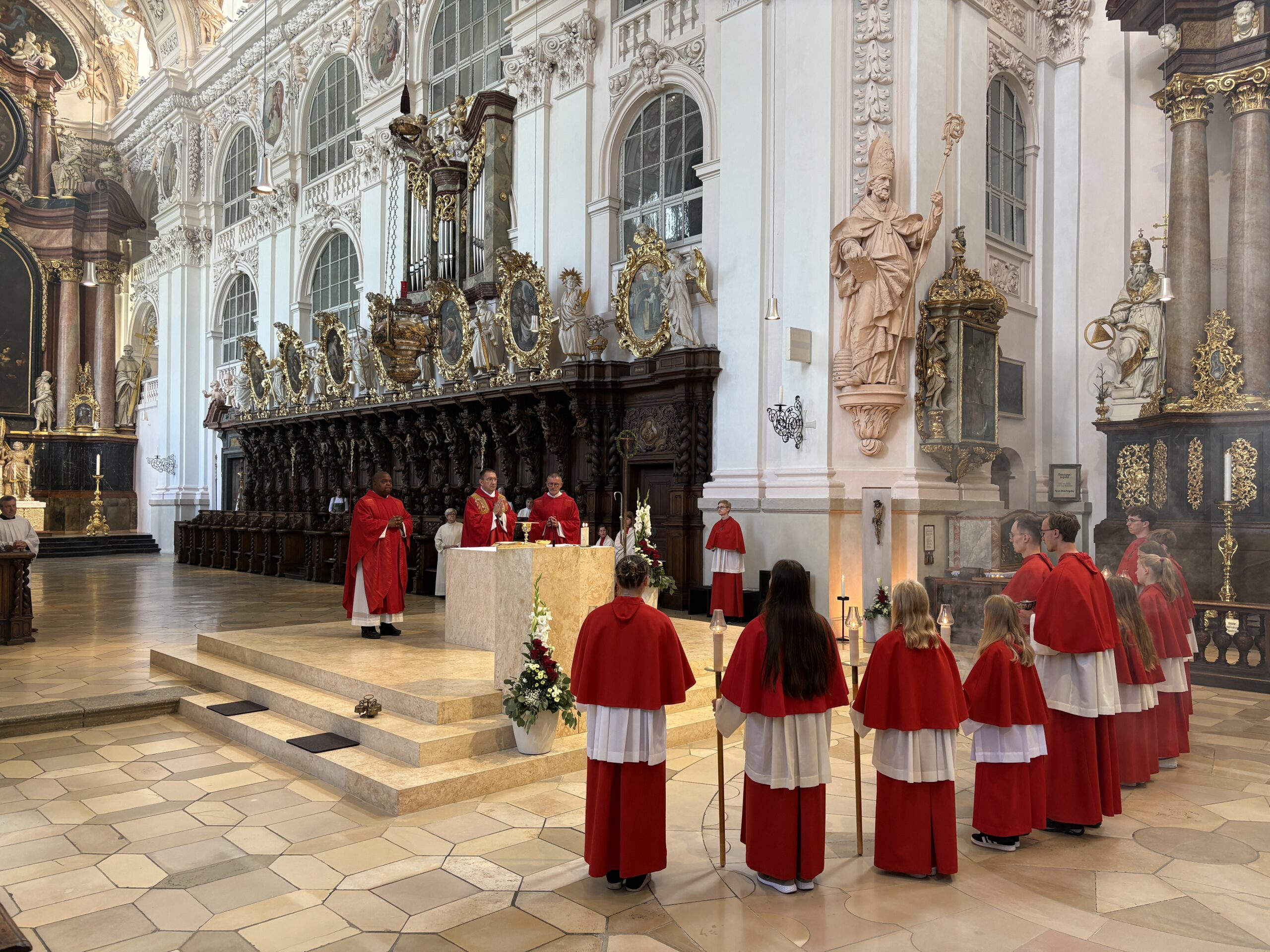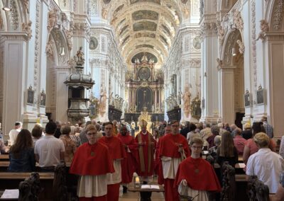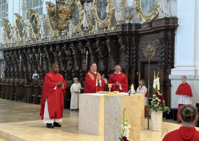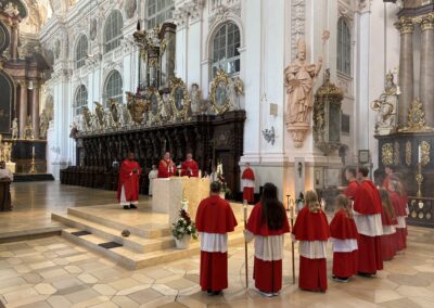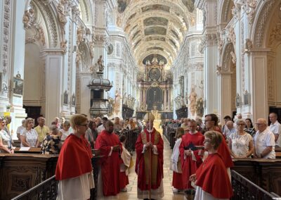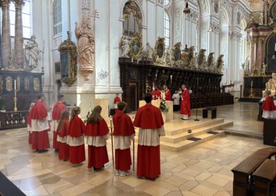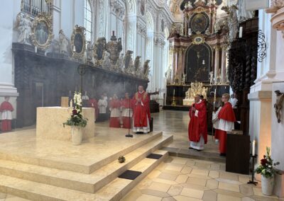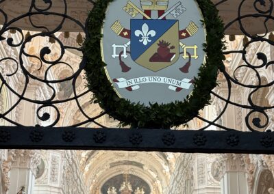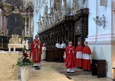 Nach dem Glaubensbekenntnis zogen der liturgische Dienst mit den Zelebranten in den Eingangsbereich der Basilika, wo Erzabt em. Korbinian Birnbacher die Wappen mit Weihwasser und Weihrauch segnete und das Basilikachor das „Tu es Petrus“ von Franz Liszt intonierte, der auch mit der „Krönungsmesse“ und dem „Laudate Dominum“ von W.A. Mozart zum Fest werden ließ.