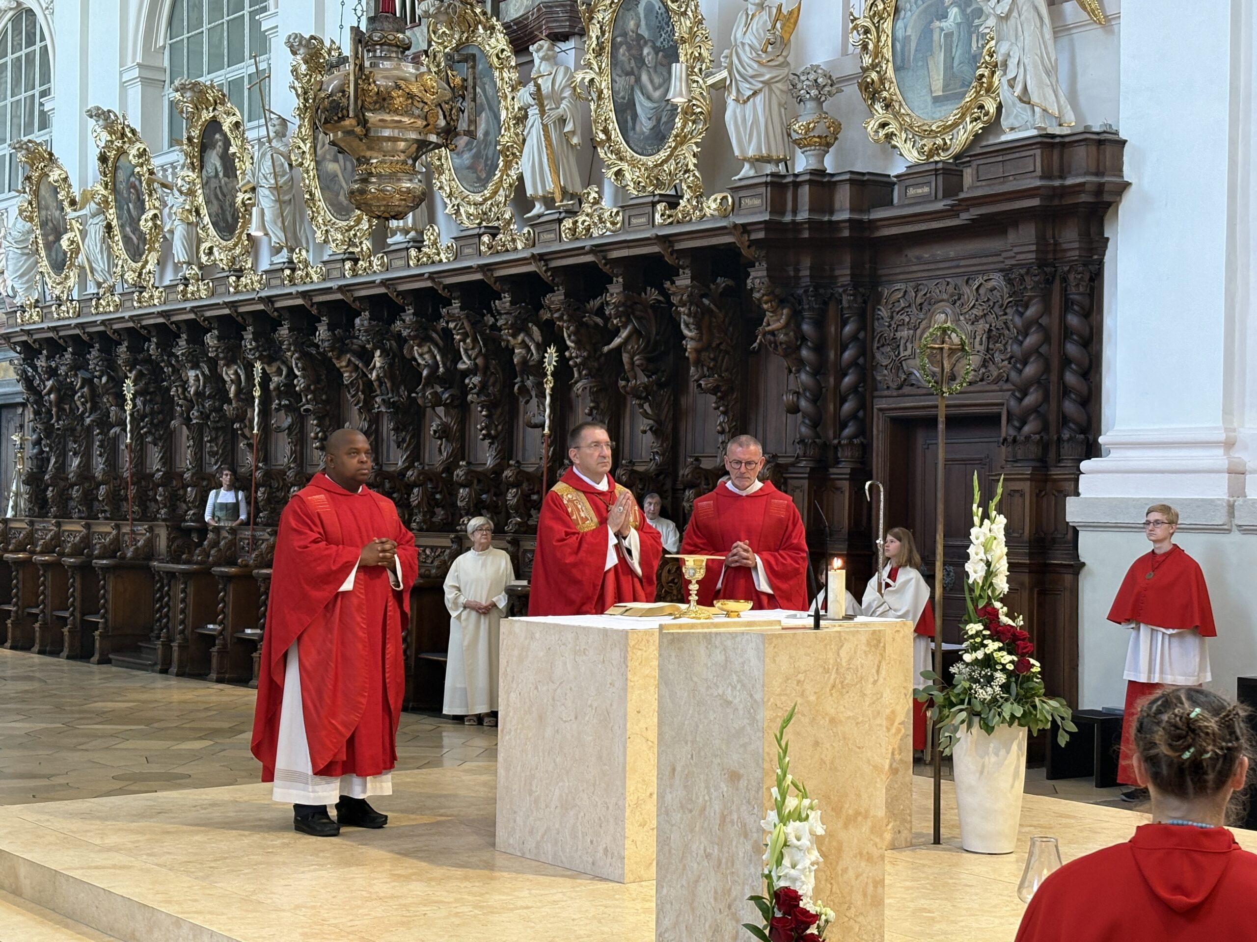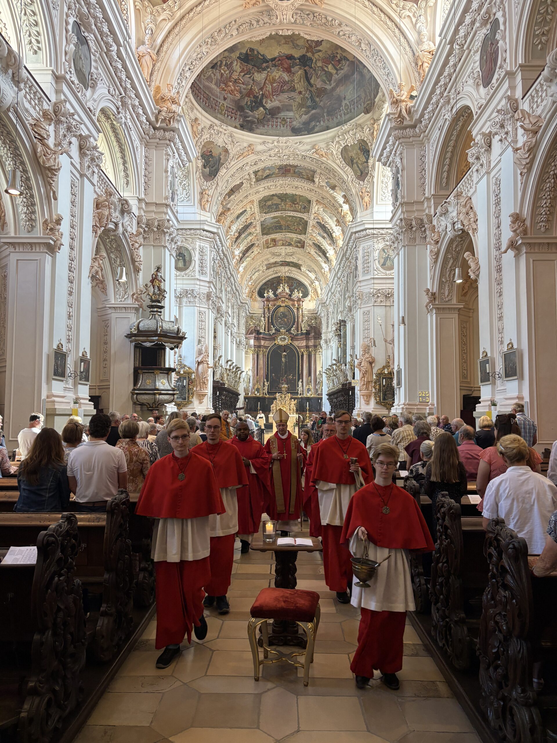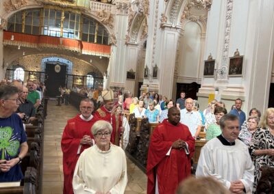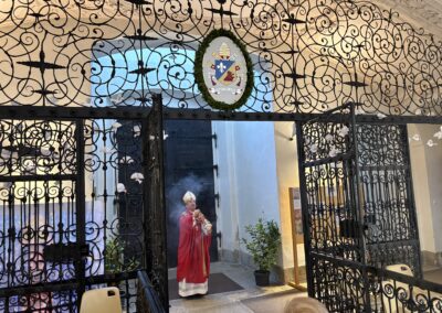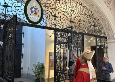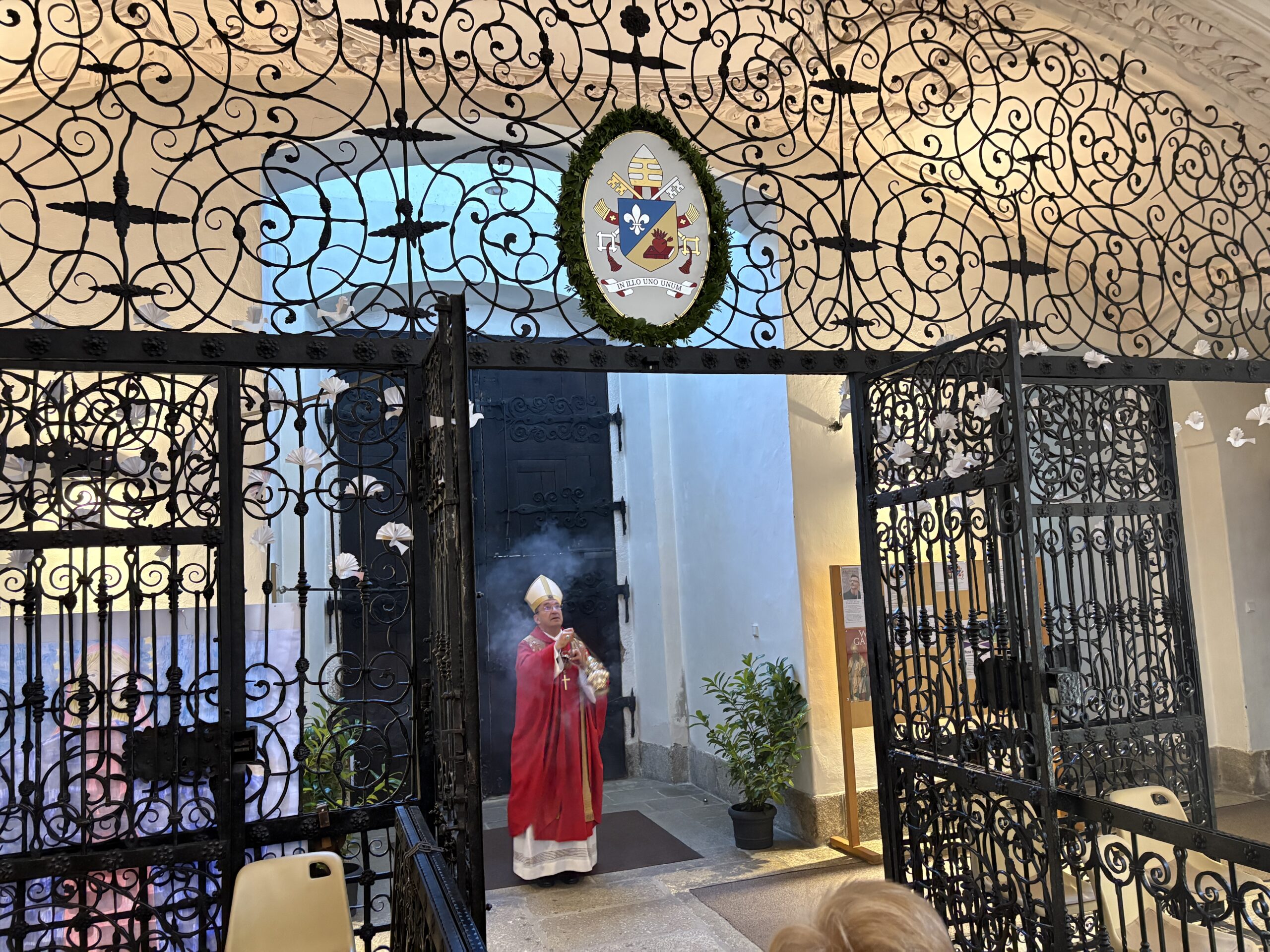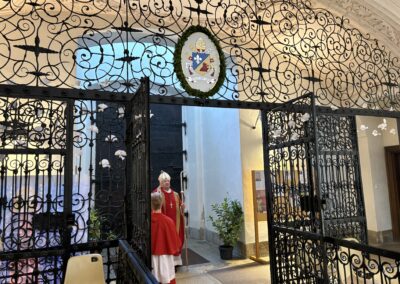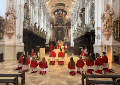 Nach dem Glaubensbekenntnis zogen der liturgische Dienst mit den Zelebranten in den Eingangsbereich der Basilika, wo Erzabt em. Korbinian Birnbacher die Wappen mit Weihwasser und Weihrauch segnete und das Basilikachor das „Tu es Petrus“ von Franz Liszt intonierte, der auch mit der „Krönungsmesse“ und dem „Laudate Dominum“ von W.A. Mozart zum Fest werden ließ.