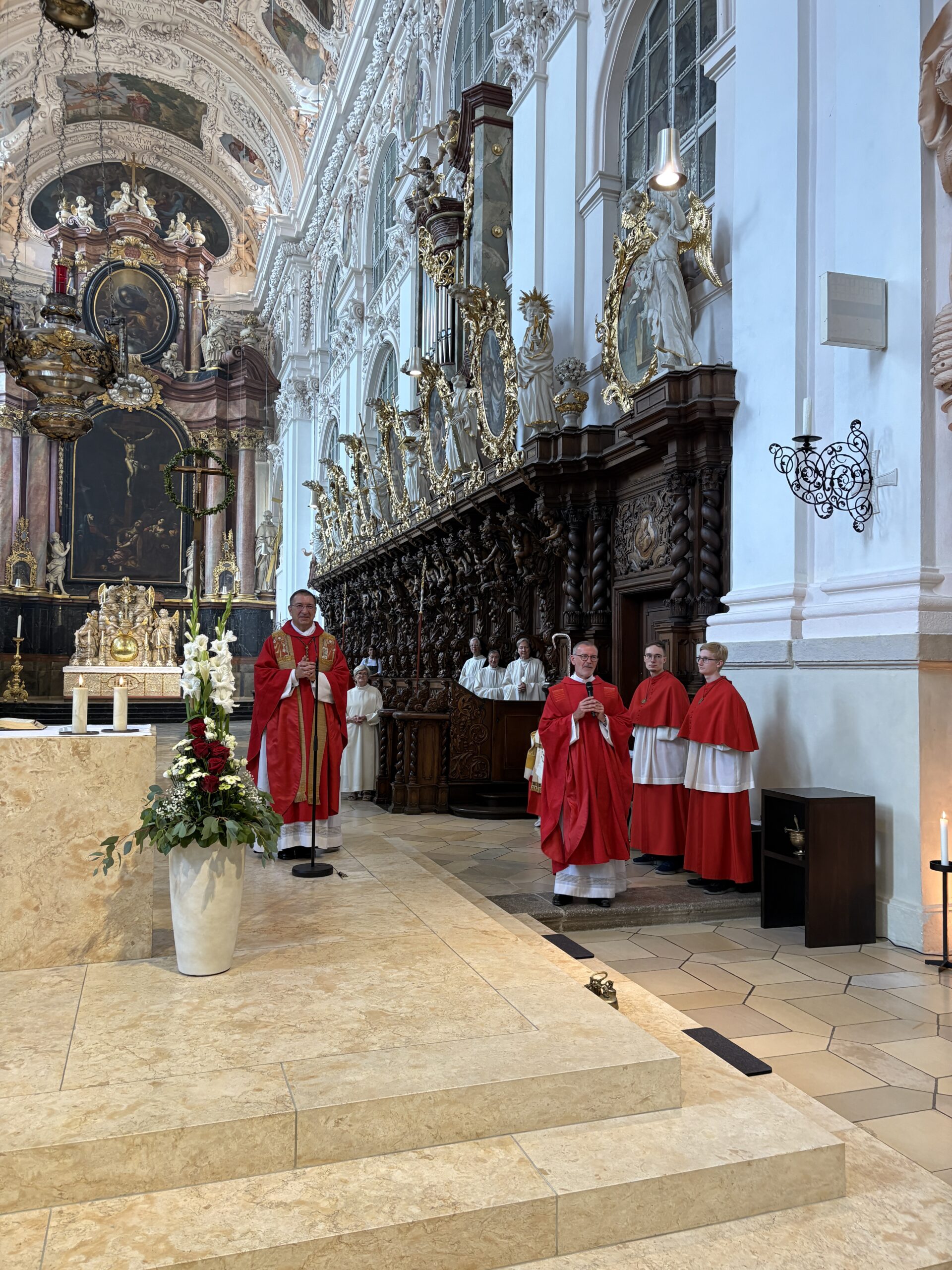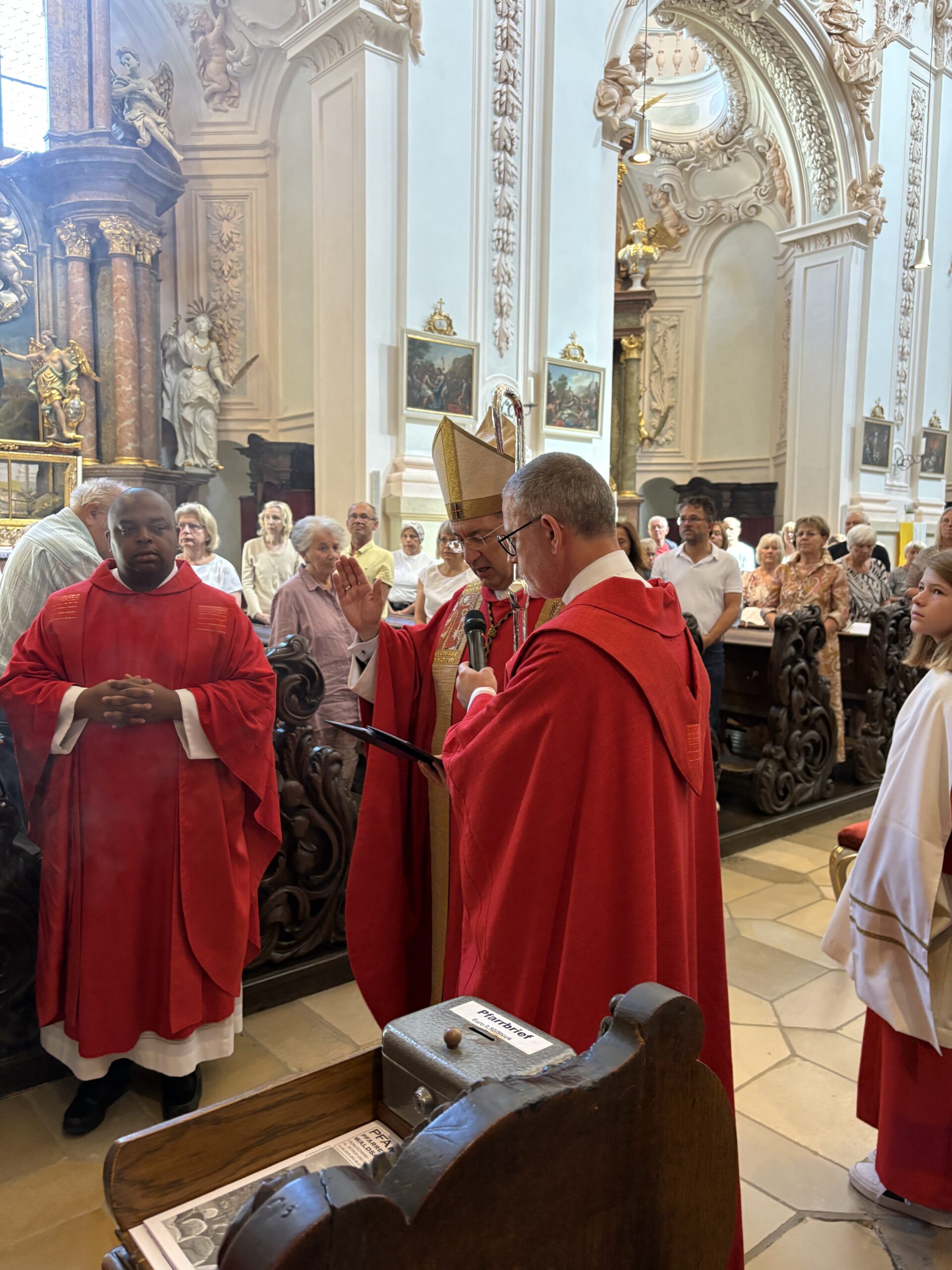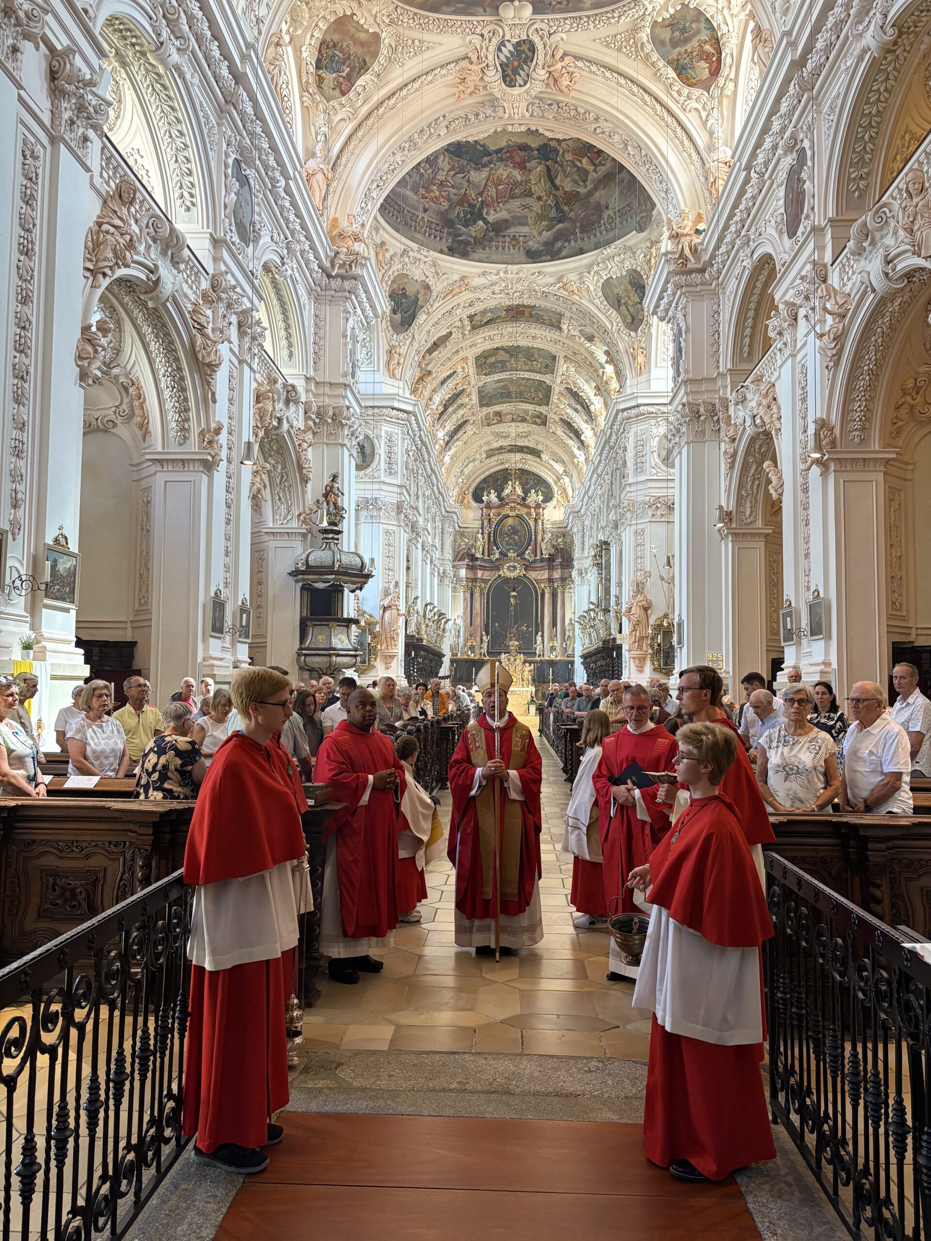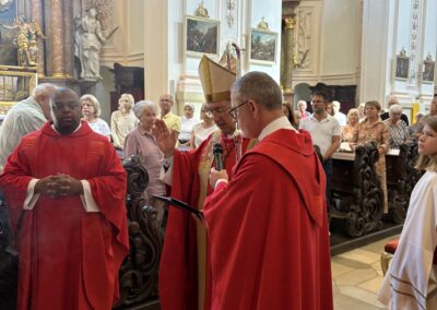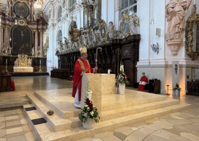 Als Hauptzelebrant und Prediger konnte Stadtpfarrer Dr. Thomas Vogl den emeritierten Erzabt Dr. Korbinian Birnbacher OSB von der Erzabtei St. Peter in Salzburg begrüßen. In seiner Predigt ging er auf die beiden Apostelfürsten Petrus und Paulus ein, deren Hochfest am 29. Juni gefeiert wird und daher auch als Tag für die Segnung des Wappens gewählt wurde. Auch wenn beide als „Apostelfürsten“ bezeichnet und ohne Zweifel eine Vorrangstellung einnehmen, so ist doch der Blick auf den ganzen Petrus und ganzen Paulus notwendig. Petrus, der Fels, war eben auch wankelmütig und hat seinen Herrn verleugnet. Paulus verfolgt die Christen zuerst mit aller Kraft, bevor seine Bekehrung ihn zum Verkünder des Evangeliums macht. „Überzogene Vorbilder katapultieren uns in denen unerfüllbaren Leistungsdruck. Deshalb ist das Beispiel von Petrus und Paulus für uns so wertvoll. Erst am Ende erkannt man ihre große Liebe zu Jesus. Es ist eben nicht die Begeisterung des Beginnens, sondern die Konsequenz echter Liebe am Ende ihres Lebens.“ – so der Prediger.