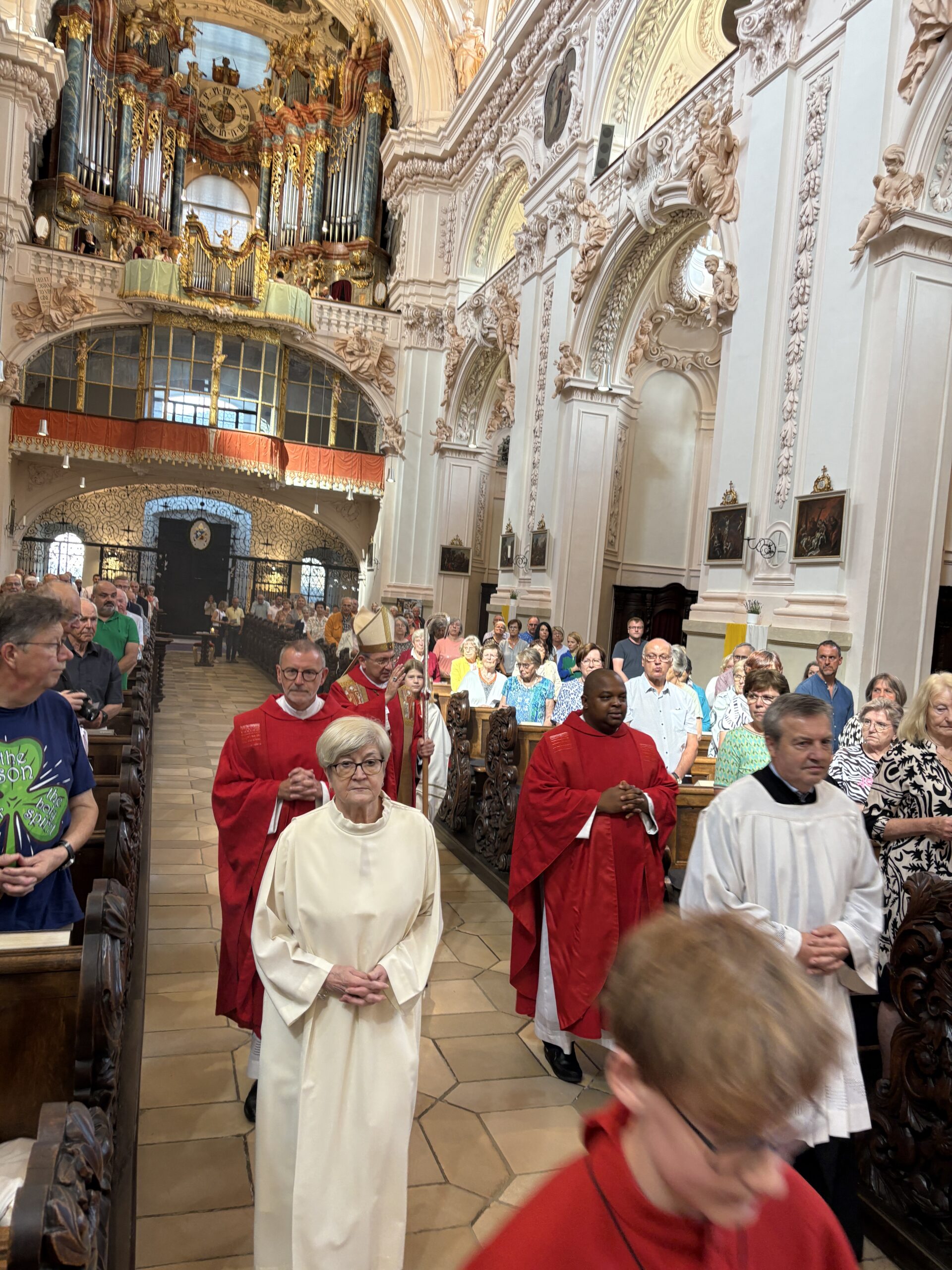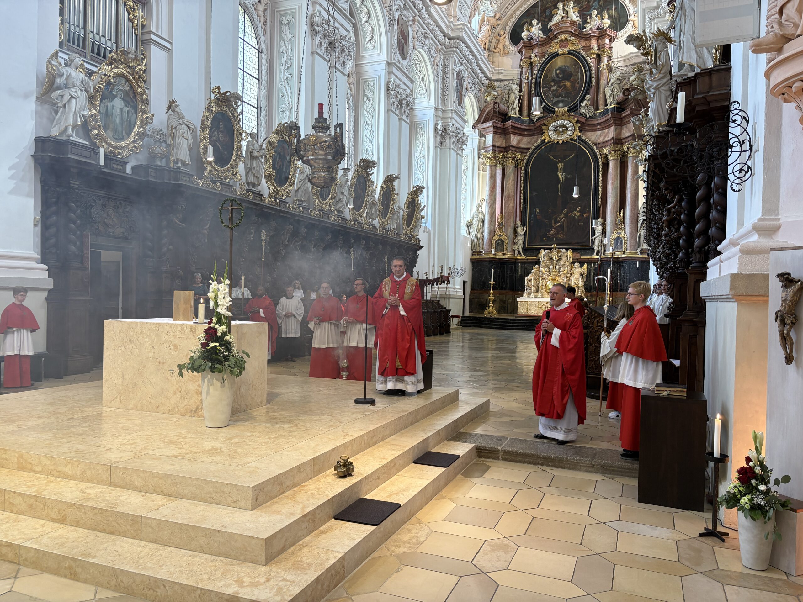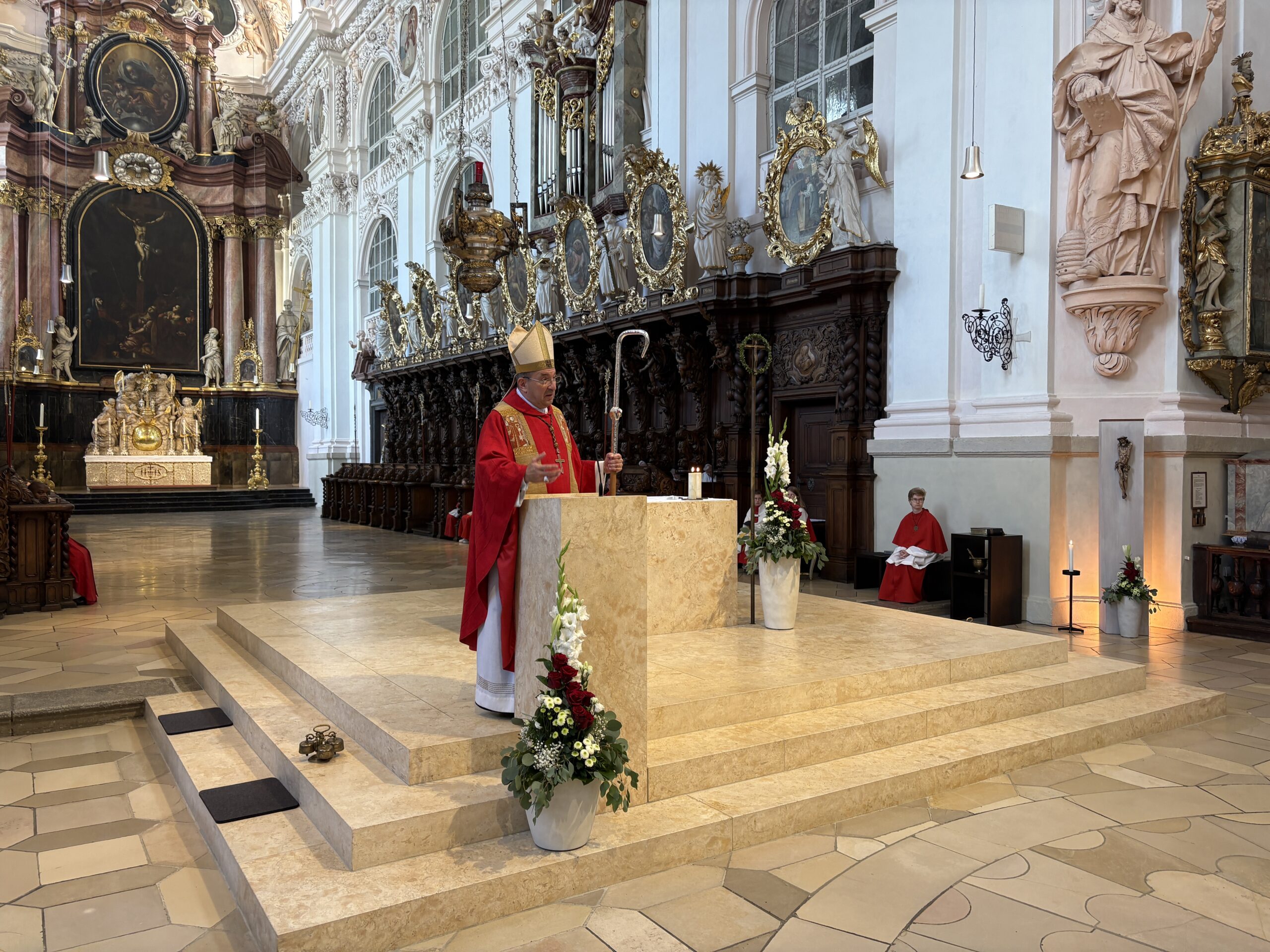 Als Hauptzelebrant und Prediger konnte Stadtpfarrer Dr. Thomas Vogl den emeritierten Erzabt Dr. Korbinian Birnbacher OSB von der Erzabtei St. Peter in Salzburg begrüßen. In seiner Predigt ging er auf die beiden Apostelfürsten Petrus und Paulus ein, deren Hochfest am 29. Juni gefeiert wird und daher auch als Tag für die Segnung des Wappens gewählt wurde. Auch wenn beide als „Apostelfürsten“ bezeichnet und ohne Zweifel eine Vorrangstellung einnehmen, so ist doch der Blick auf den ganzen Petrus und ganzen Paulus notwendig. Petrus, der Fels, war eben auch wankelmütig und hat seinen Herrn verleugnet. Paulus verfolgt die Christen zuerst mit aller Kraft, bevor seine Bekehrung ihn zum Verkünder des Evangeliums macht. „Überzogene Vorbilder katapultieren uns in denen unerfüllbaren Leistungsdruck. Deshalb ist das Beispiel von Petrus und Paulus für uns so wertvoll. Erst am Ende erkannt man ihre große Liebe zu Jesus. Es ist eben nicht die Begeisterung des Beginnens, sondern die Konsequenz echter Liebe am Ende ihres Lebens.“ – so der Prediger.