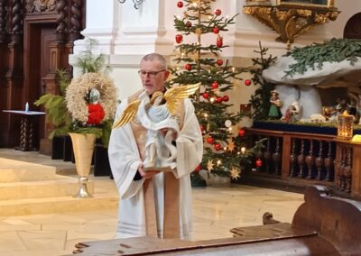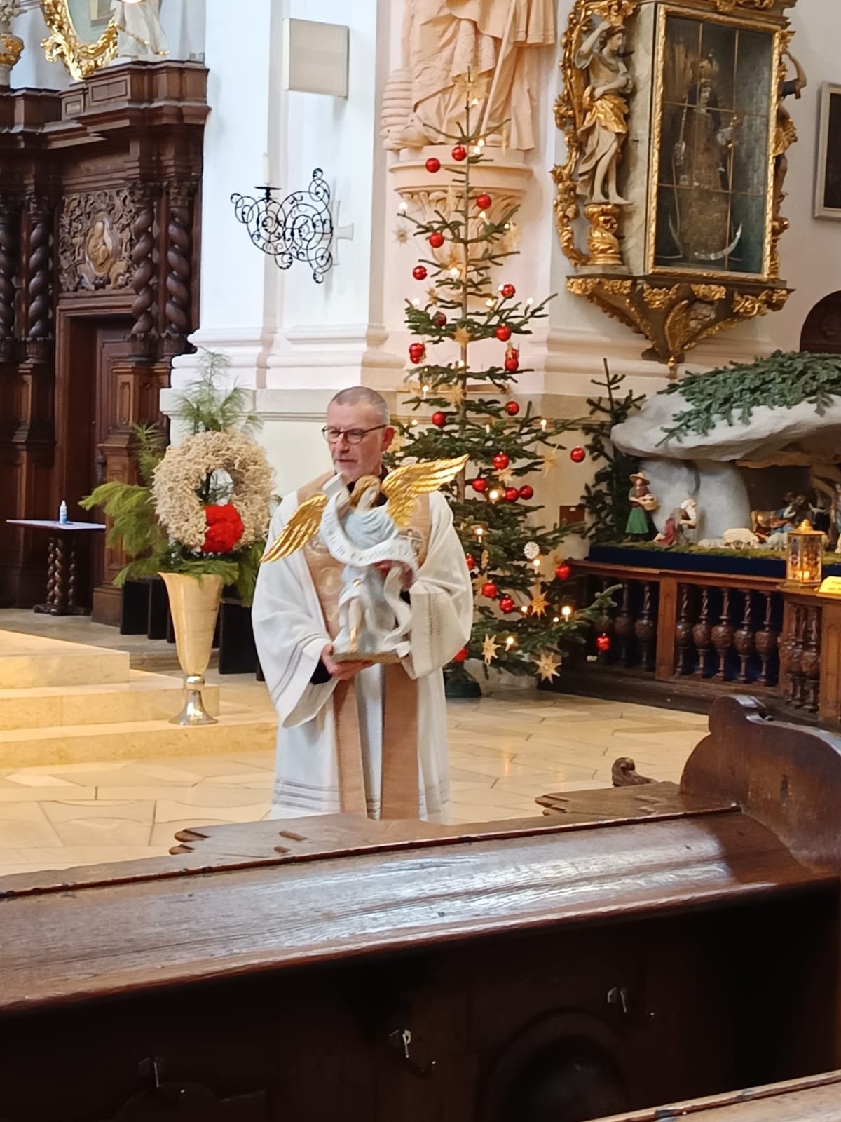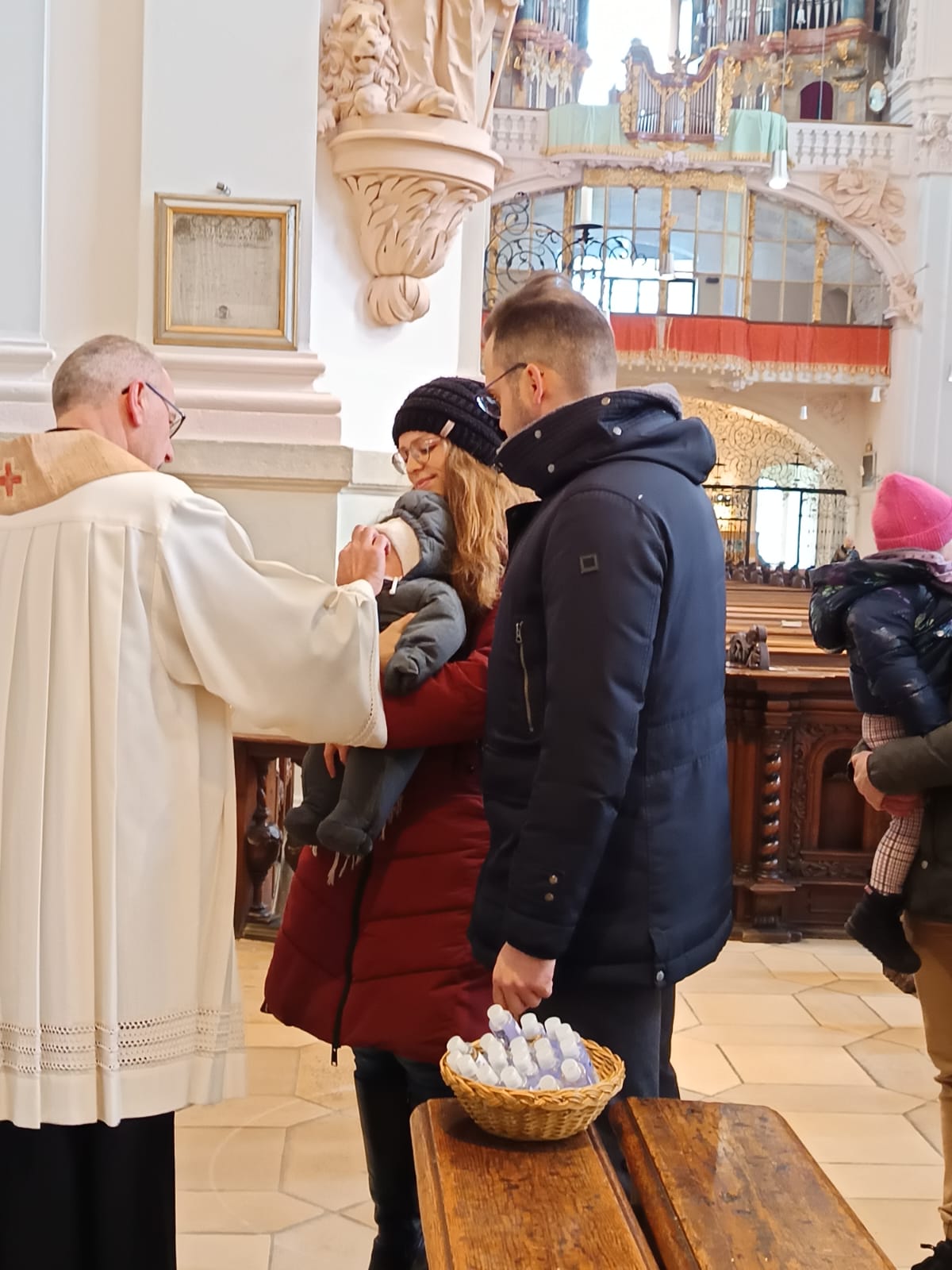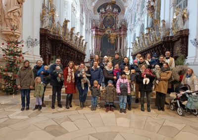 Die Pfarreiengemeinschaft hatte am Samstag, 11. Januar 2025, alle Familien eingeladen, die im letzten Jahr die Taufe ihres Kindes gefeiert haben. Auftakt war eine kurze Andacht in der Basilika, bei der Stadtpfarrer Dr. Thomas Vogl drei Figuren aus der Krippe auswählte und diese auf die Familien bezog. Es braucht viele „Engel“, die die Eltern begleiten und unterstützen in der Erziehung der Kinder. Mit dem kleinen Hirtenjungen wies Pfr. Vogl darauf hin, dass die Kinder einmal ihre Berufung finden sollen. Zuletzt war einer der Heiligen Drei Könige Bild für die „Königswürde“, die jedes Kind in der Taufe empfängt und mit der jeder Christ sein Leben und das seiner Mitmenschen schätzen soll. Nach der Segnung der Kinder mit Weihwasser waren alle Familien in das Kath. Jugendheim zu Kaffee und Kuchen eingeladen. Der Sachausschuss Ehe und Familie bewirtete und hatte vor allem für die Kleinen auch eine Spielwiese parat.