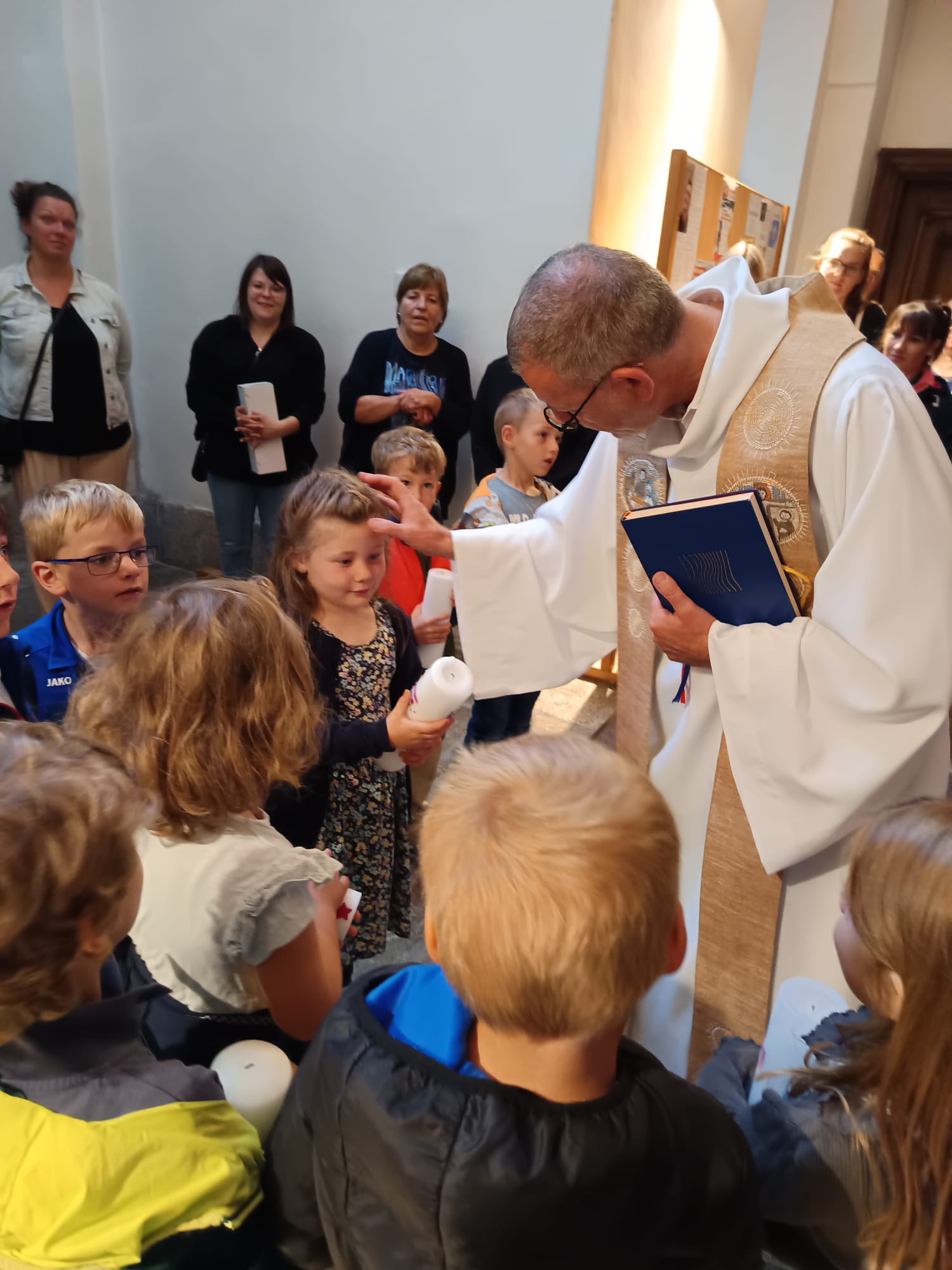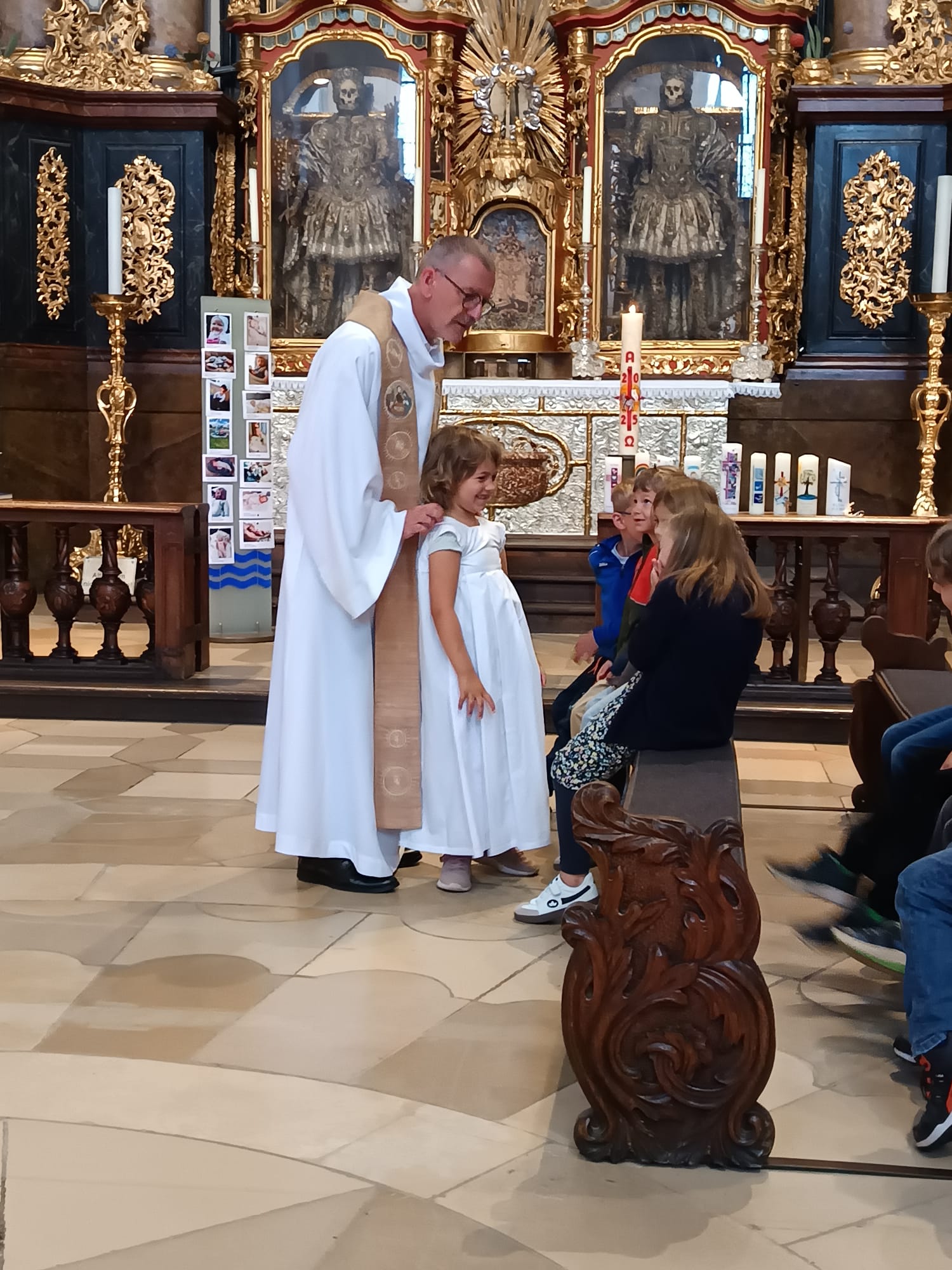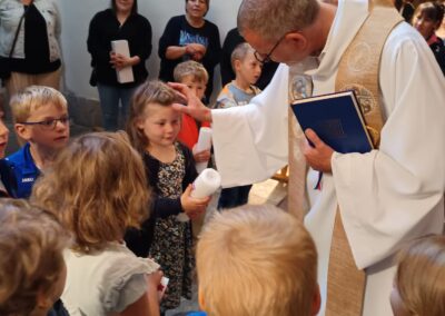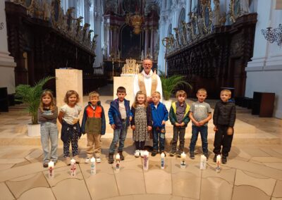 Nach einer kleinen Pause legten die Kinder mit bunten Tüchern die Kulisse für die Geschichte der Taufe Jesu im Jordan. Danach erwartete sie Stadtpfarrer Dr. Thomas Vogl am Hauptportal der Basilika. Er erklärte ihnen die wichtigsten Zeichen der Taufe. Jedes Kind durfte die segnende Hand spüren, den Duft des Chrisams riechen und die eigene Taufkerze an der Osterkerze entzünden.