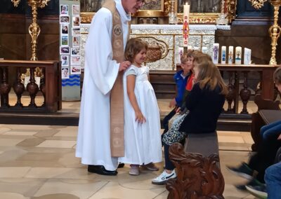Pfarrer Vogl dankte den vielen anwesenden Eltern, Großeltern und Paten und ermutigte sie, auch im Alltag an die Taufe zu erinnern – zum Beispiel durch das Anzünden der Taufkerze an besonderen Tagen wie dem Geburtstag oder Namenstag.